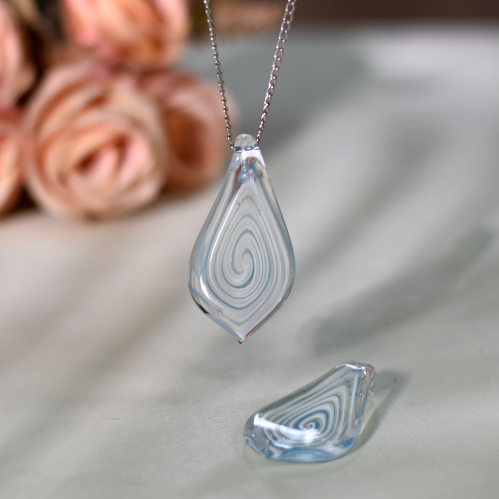 Channel the calming beauty of nature with this Turquoise Spiral Leaf Lampwork Glass Pendant, a handcrafted masterpiece shaped in the likeness of a swirling leaf. Made using the age-old lampwork technique, each pendant features intricate spirals and transparent layers of turquoise glass that evoke the tranquility of ocean waves. Perfect for jewelry making, this piece brings together natural inspiration and artisanal craftsmanship to create a pendant that feels both graceful and timeless.