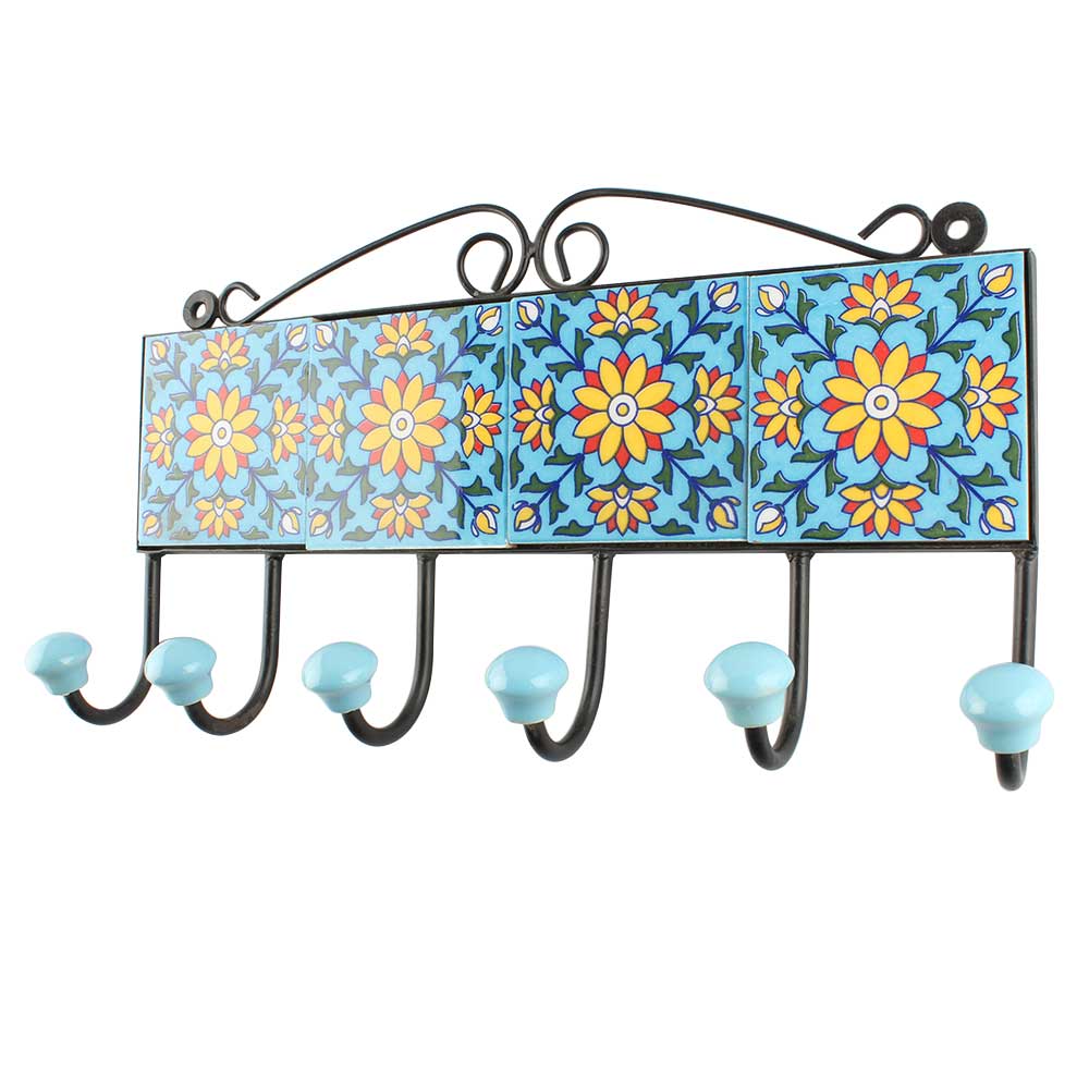 Turquoise Sunflower Ceramic Tiles Hook Online. When Put on Wall or Cabinet It is An Art in Itself. The Metal Part of this Hook is Black Powder Coated.