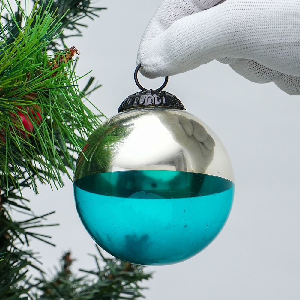 Turquoise Vintage Style Round Glass Christmas Ornament. Crafted from high-quality glass with a smooth glossy finish, this decorative bauble adds a classic and festive touch to Christmas trees, wreaths, and holiday displays.