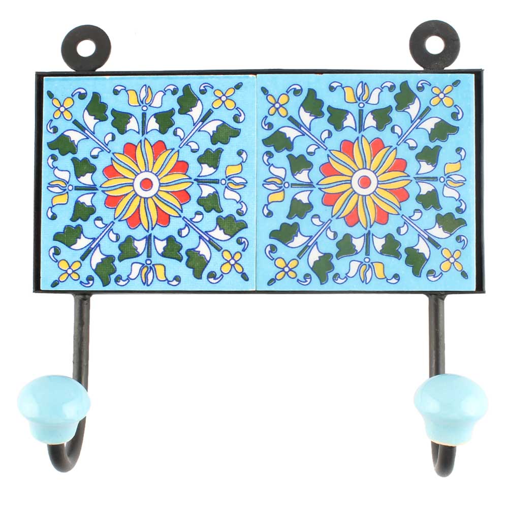 Turquoise Wheel Flower Ceramic Tile Hook. When Put on Wall or Cabinet It is An Art in Itself. The Metal Part of this Hook is Black Powder Coated.