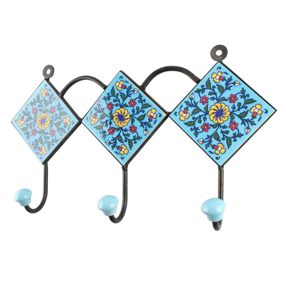 Turquoise With Yellow Wheel Flower Ceramic Tiles Hook. When Put on Wall or Cabinet It is An Art in Itself. The Metal Part of this Hook is Black Powder Coated.