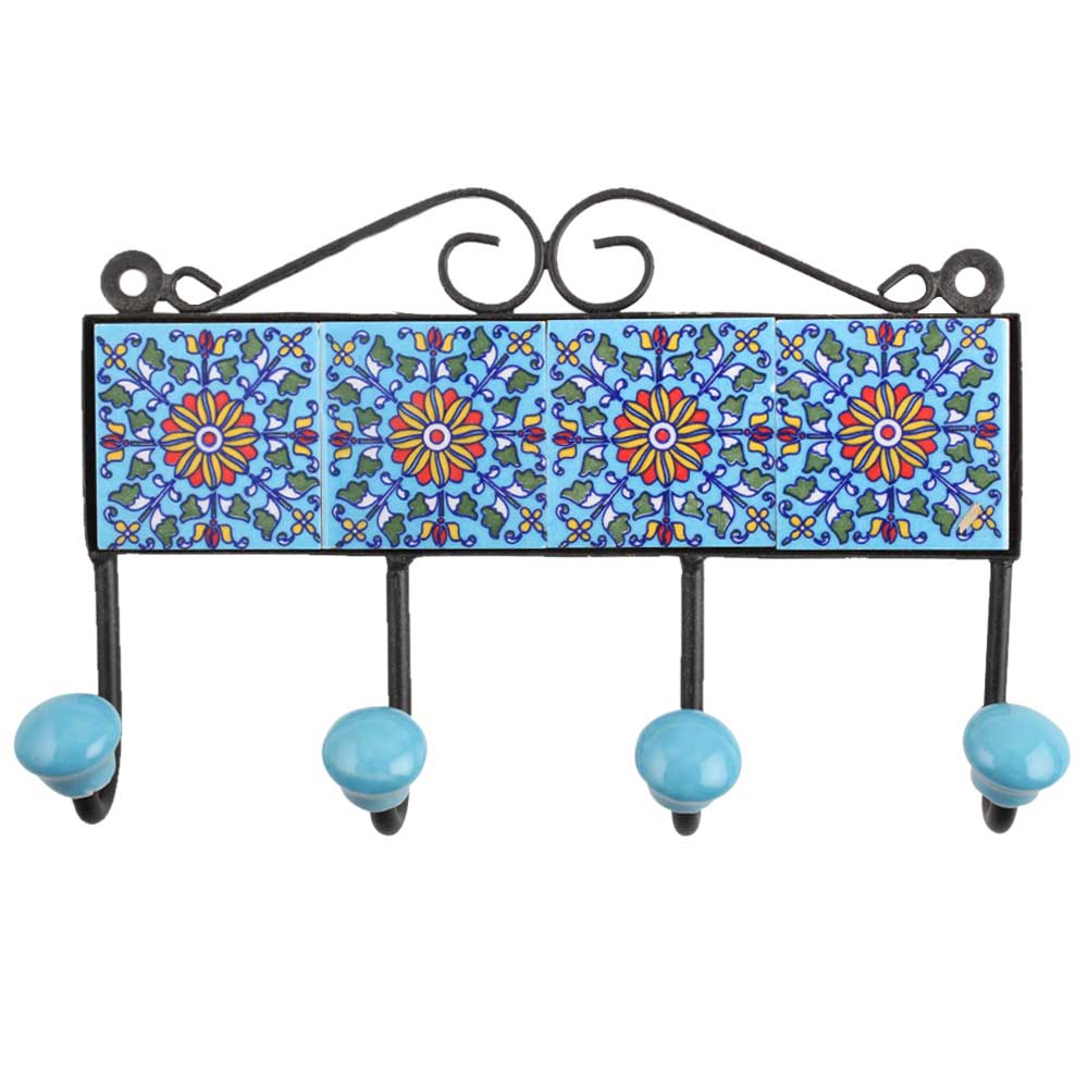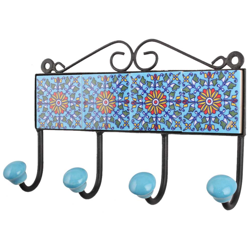 Turquoise Yellow Floral Tiles Hook. When put on wall or cabinet it is an art in itself. The metal part of this hook is black powder coated.
