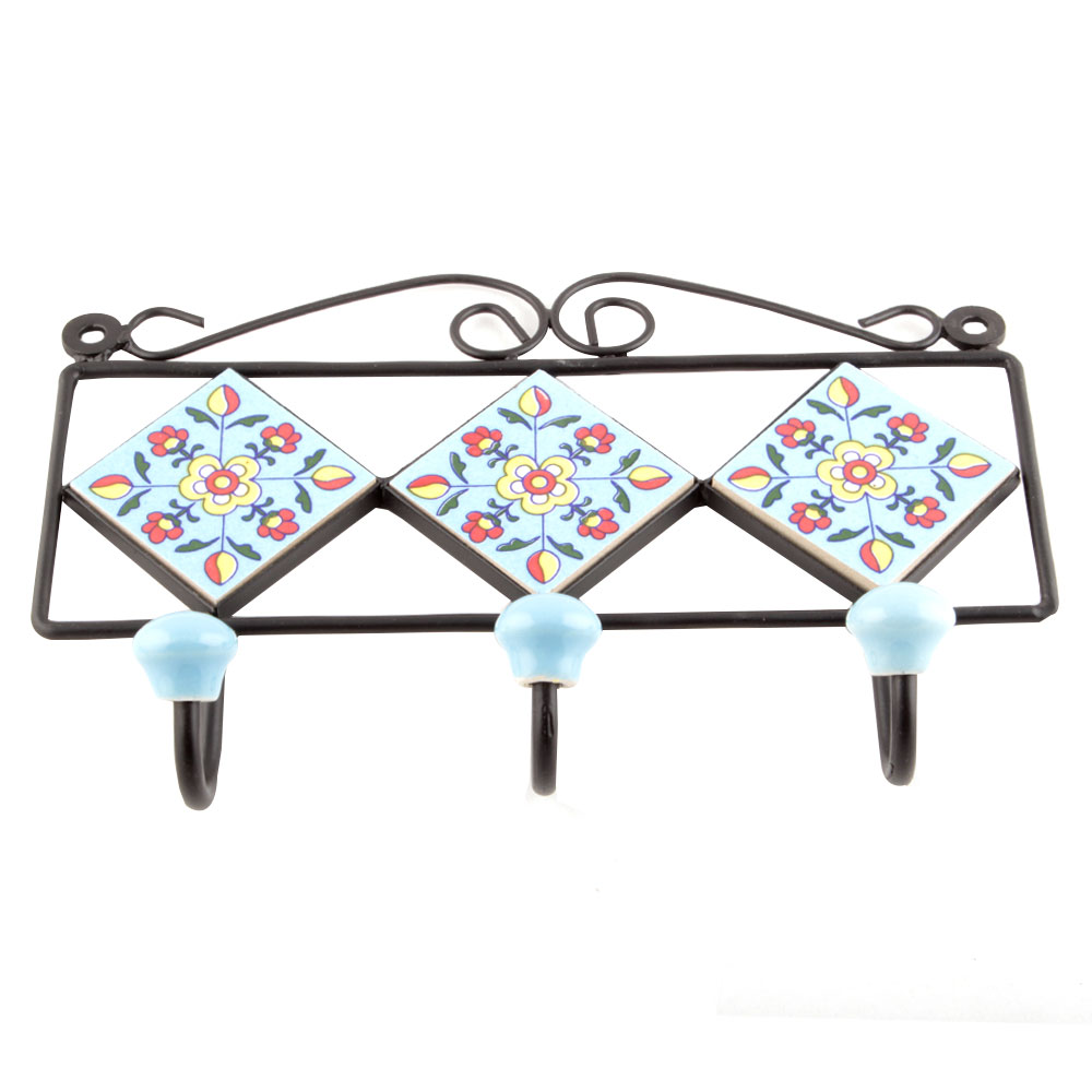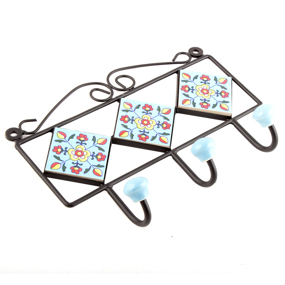 Turquoise Yellow Floral Tiles Hooks. When Put on Wall or Cabinet it is an Art in itself. The Metal Part of this Hook is Black Powder Coated.