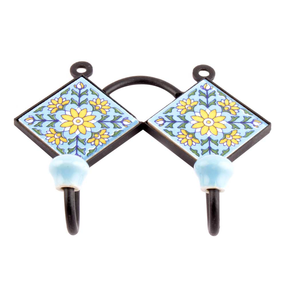 Turquoise Yellow Sunflower Tiles Hooks. When Put on Wall or Cabinet it is an Art in itself. The Metal Part of this Hook is Black Powder Coated.
