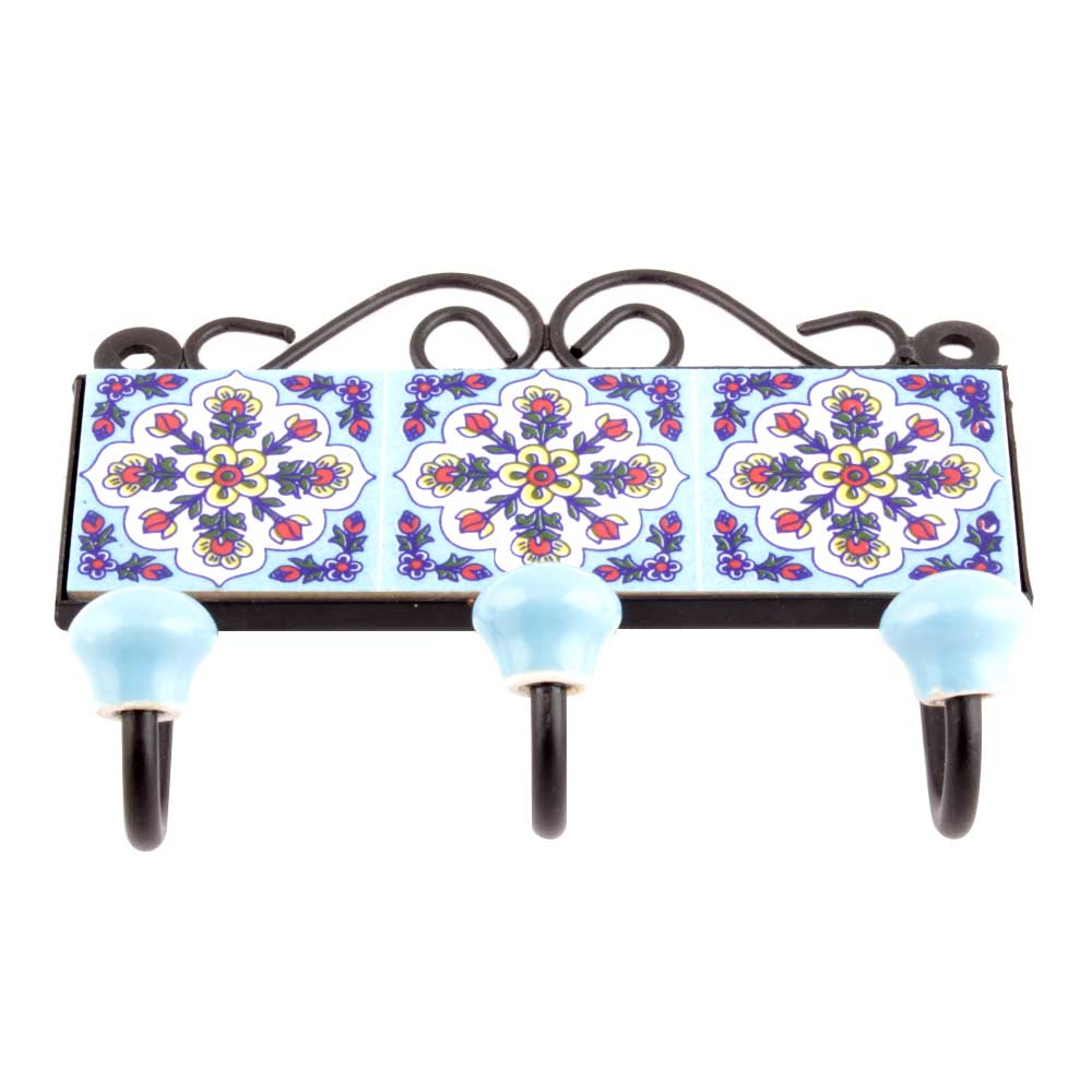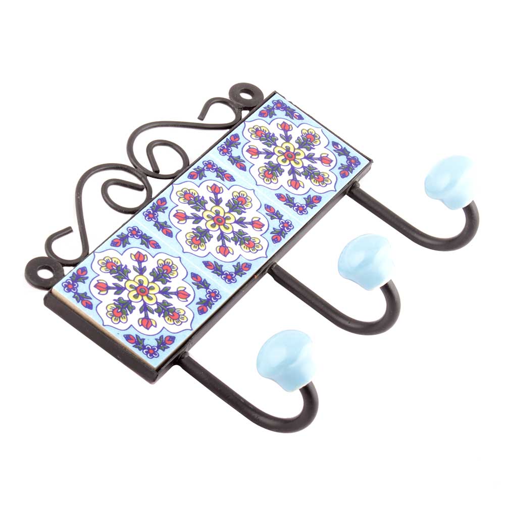 Turquoise Yellow Tiny Flower Tiles Hooks. When Put on Wall or Cabinet it is an Art in itself. The Metal Part of this Hook is Black Powder Coated.