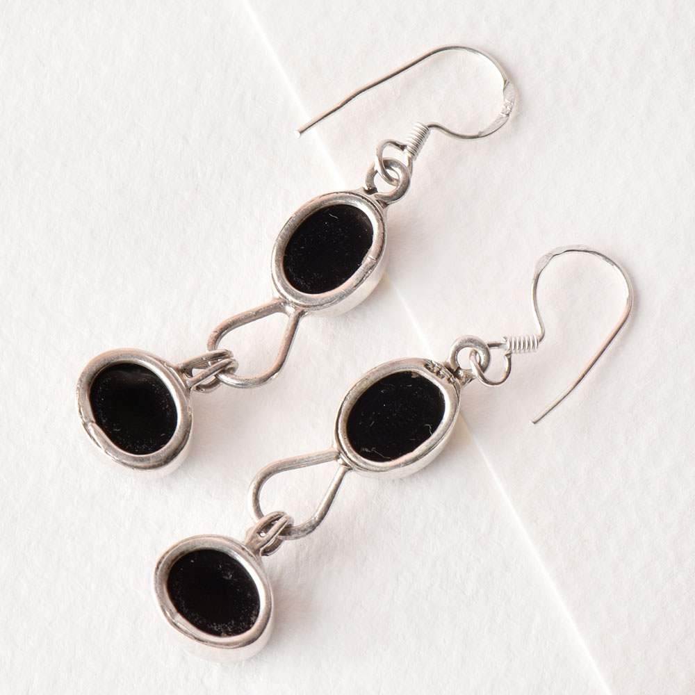 Twin Black Onyx 92.5 Sterling Silver Earrings Oval Shape Dangler Earrings
