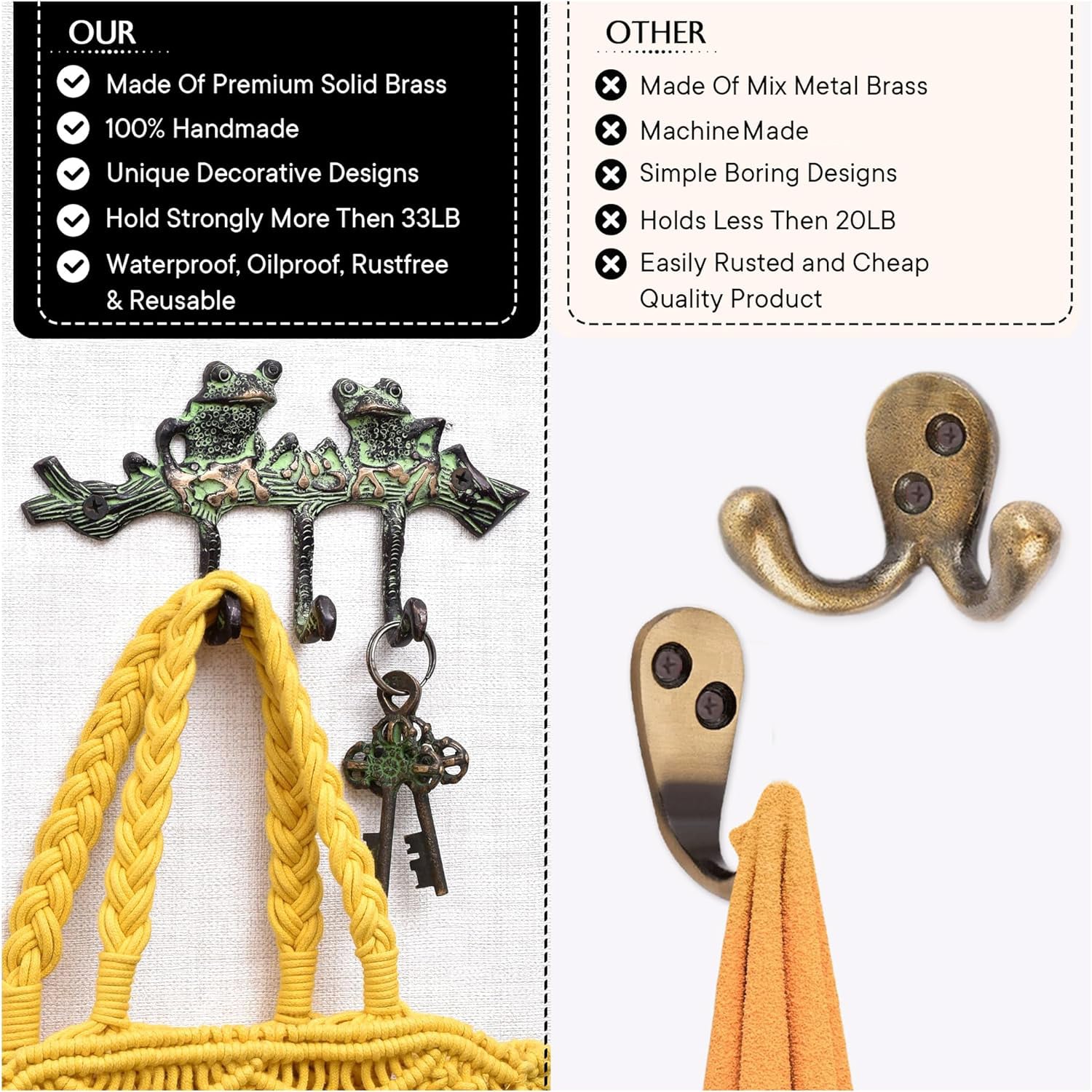 Indianshelf.com for bulk/wholesale orders.Indianshelf.us for personal purchases.The Brass Patina Green Frogs Hook is a whimsical and charming accent piece that brings a playful touch of nature to your home décor. Featuring intricately designed frogs with a patina green finish, this hook is perfect for adding character and style to any room while providing a practical solution for hanging coats, bags, hats, or keys.