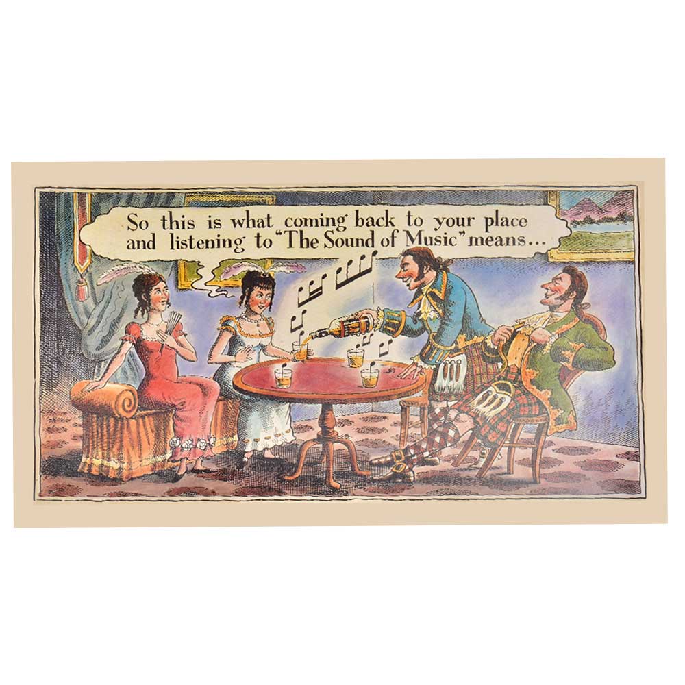 Liquor Signed Color Poster Every Sip is pure music Seagram's 100 Pipers Rare Color Litho print depicting Bar Scene-2 wealthy females in bar enjoying drinks with a gentelman and a bartender pouring scotch whiskey in their glasses bottle.