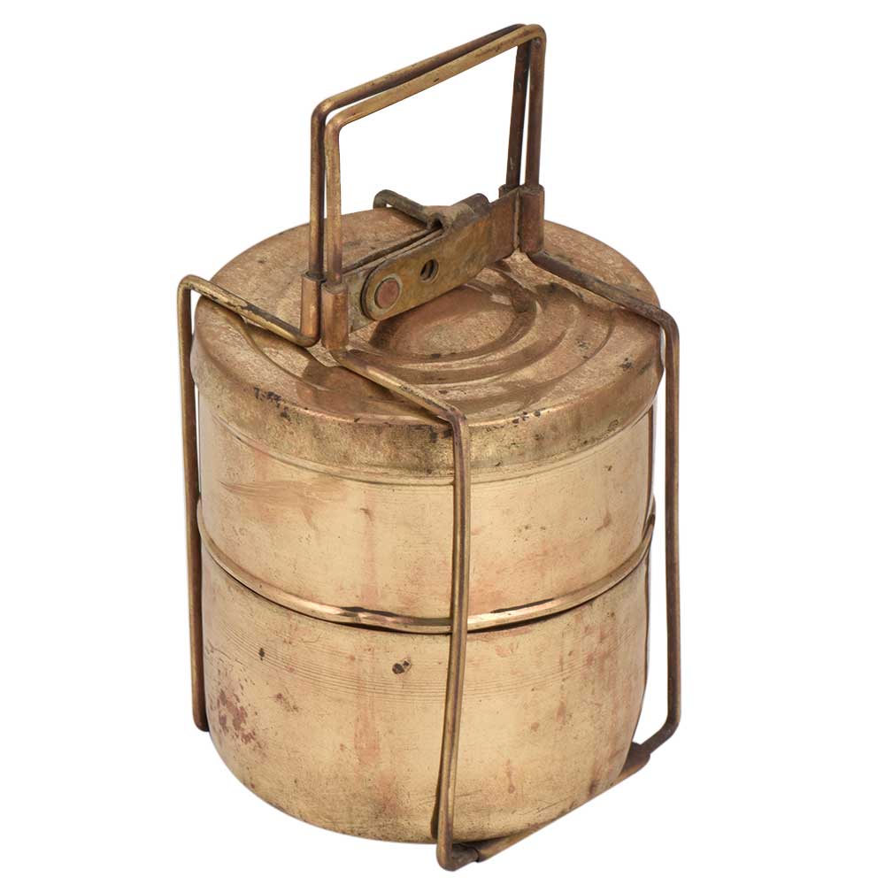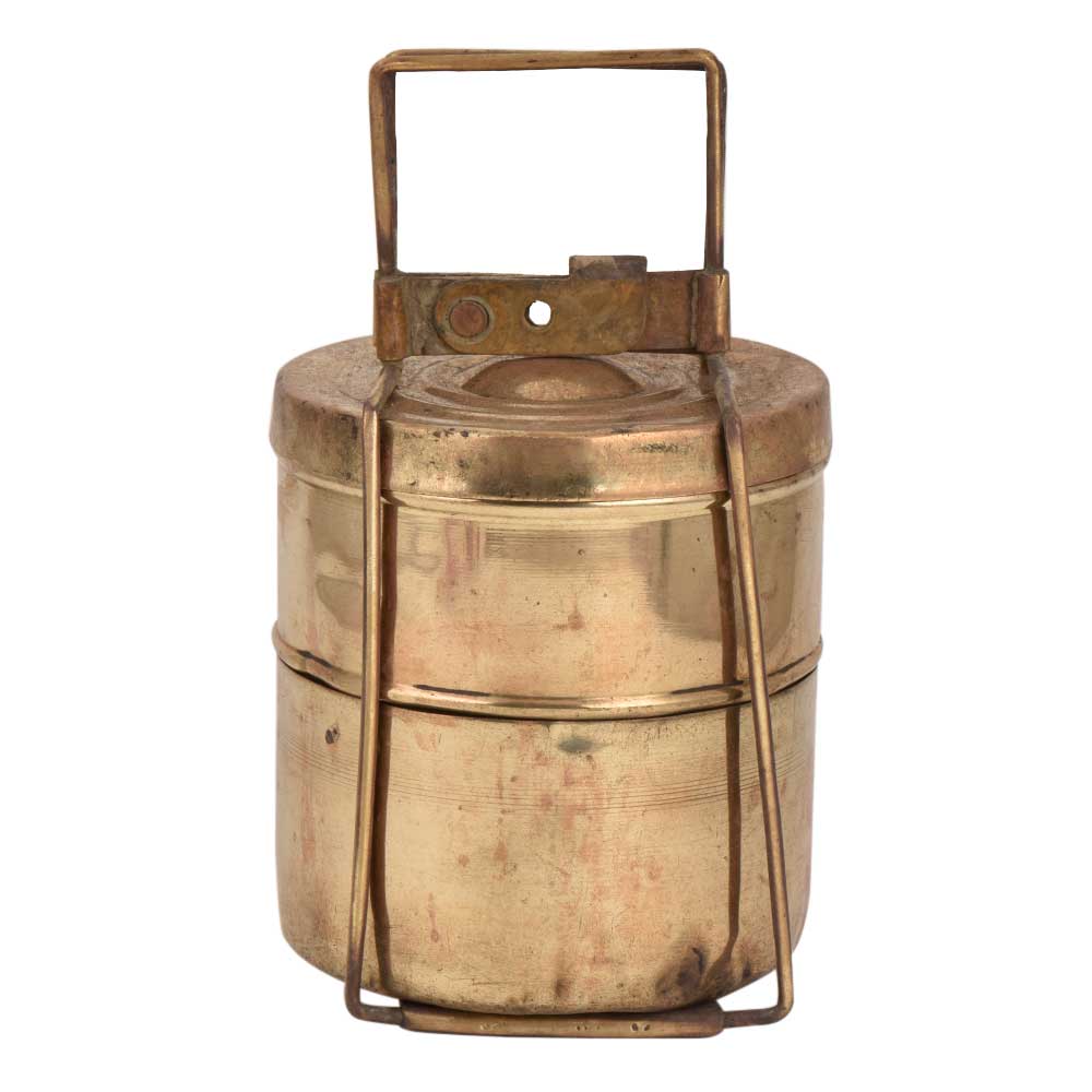 Handmade brass Tiffin box with two containers with a metal frame with two containers that is kept one above the other . It has a metal frame with a lock that keeps all the containers intact . It was earlier used for transportation of food but it is now used for home decoration on the dining table, kitchen shelf, for flower display, candies storage box or gift for your near and dear ones.