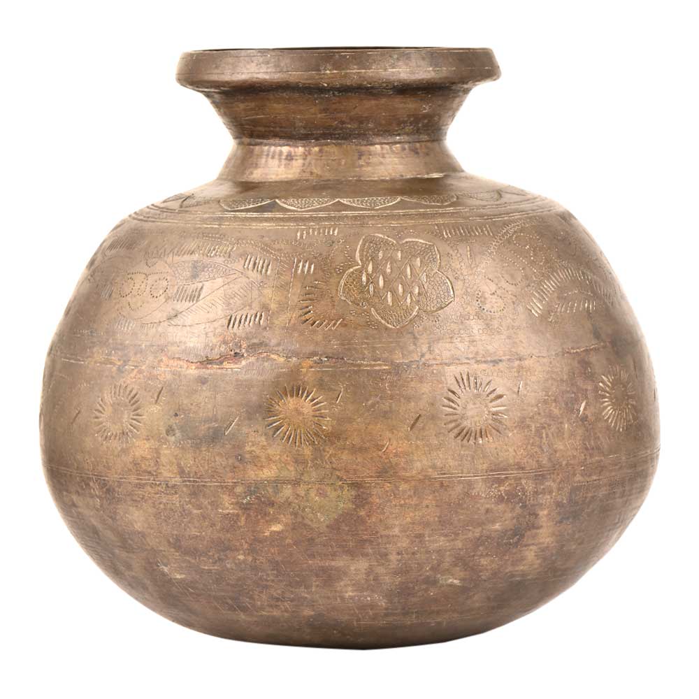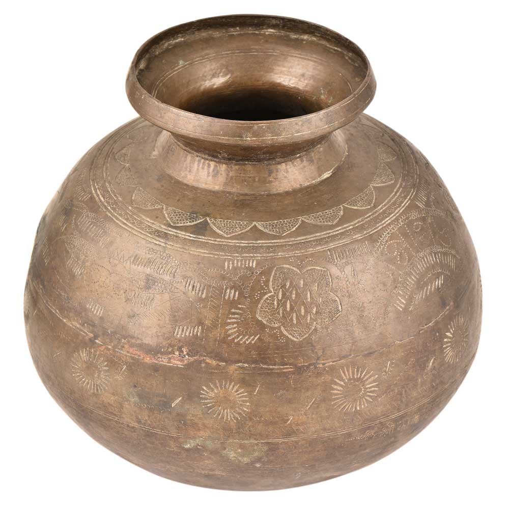 This is a rather unique shaped lota or pot with rough and uneven tribal carvings on the surface a protuding rim or neck with a small mouth . The pot would make a lovely shelf ornament flower pot or table display.