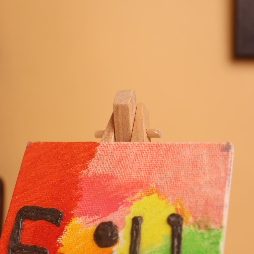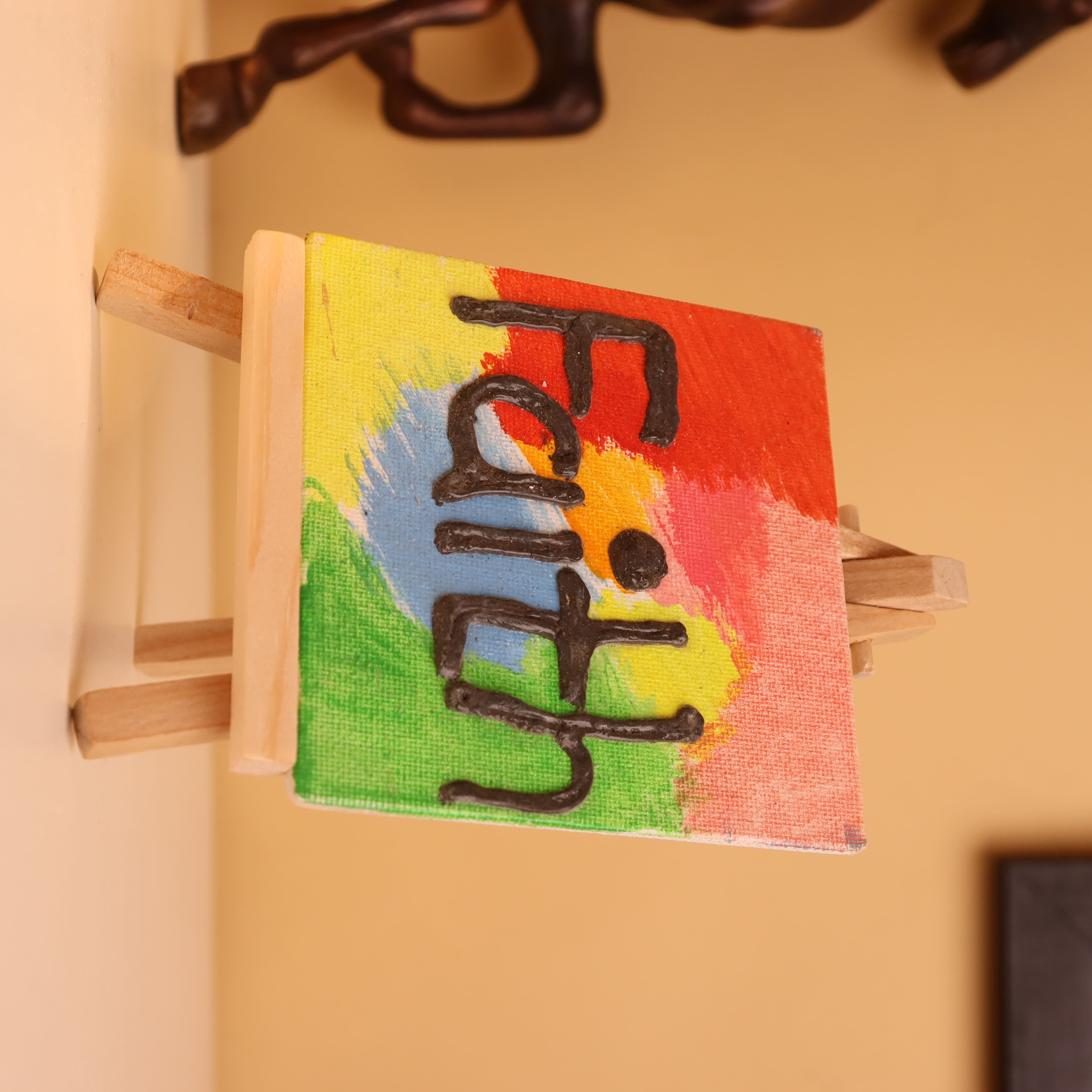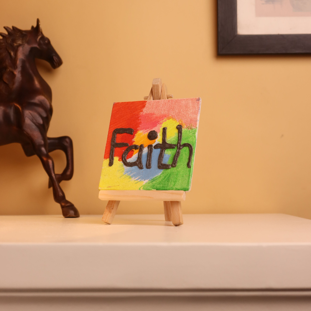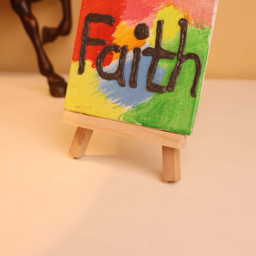Inspire your day with this vibrant 4x4 inch handcrafted canvas painting featuring the word “Faith” in bold, raised textured paint. This mini masterpiece is adorned with a lively blend of colors—red, orange, yellow, blue, and green—each brushstroke contributing to an abstract, energetic background that symbolizes hope and renewal. The word “Faith” is rendered in thick black textured paint, creating a striking 3D effect that adds both depth and dimension to the artwork. Perfectly sized for desks, shelves, or bedside tables, this canvas sits on a wooden easel and brings a burst of positivity to any space. Whether you’re gifting encouragement to a loved one or adding a touch of inspiration to your own surroundings, this handcrafted piece is a meaningful addition to any collection. Each artwork is uniquely created with textured acrylic paint, making every piece one-of-a-kind. Let this painting be your daily reminder to hold onto faith, even in small moments.