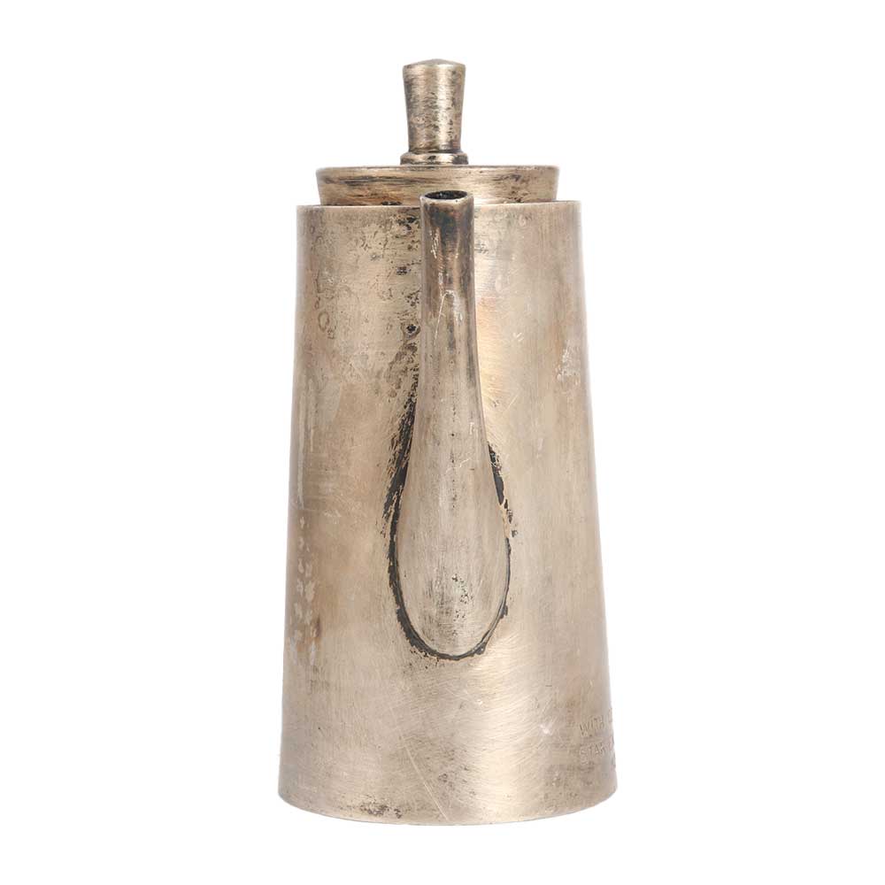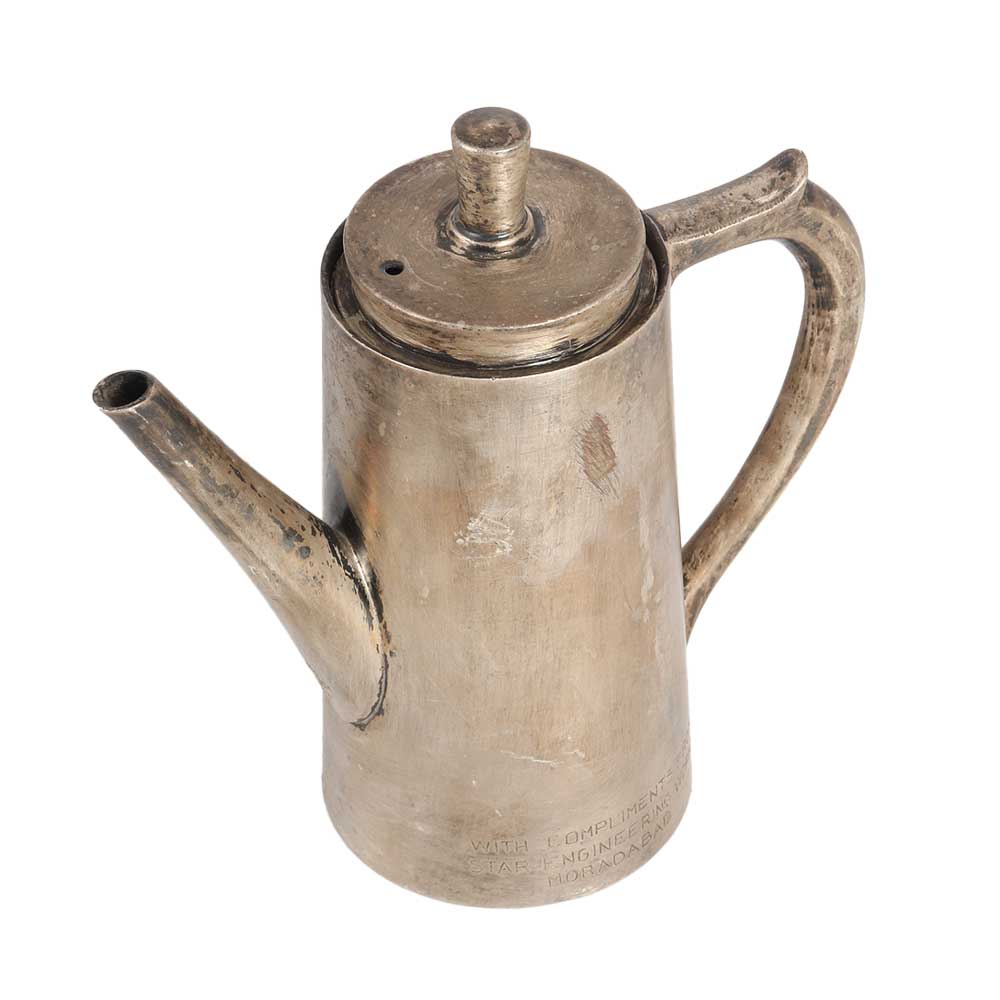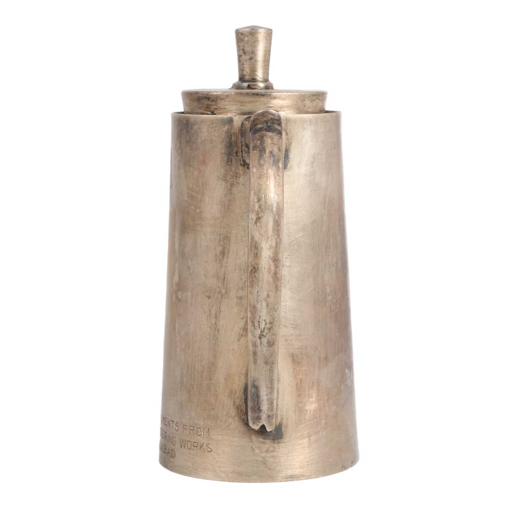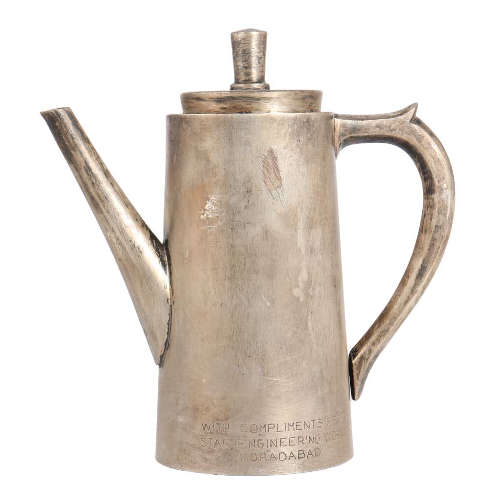 A nickel-plated brass kettle made by professional Indian craftsmen using traditional methods. This brass kettle is designed in English art, which gives an aesthetic look to your interior. It has been used in homes, restaurants and hotels to store drinking water. Since it is made of high quality brass, it keeps the water clean and has many health benefits. However, since it is a used and old item, we recommend using this brass kettle for decoration purposes only. It has a narrow spout, a handle and a lid. Add this exquisite piece to your vintage art collection or display it in an exhibition or museum and it will be the centre of attraction for visitors. Give it as a gift to your loved ones on special and festive occasions.