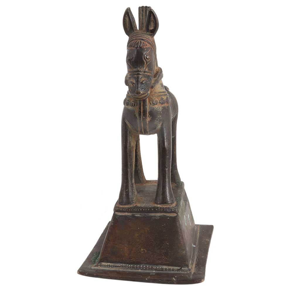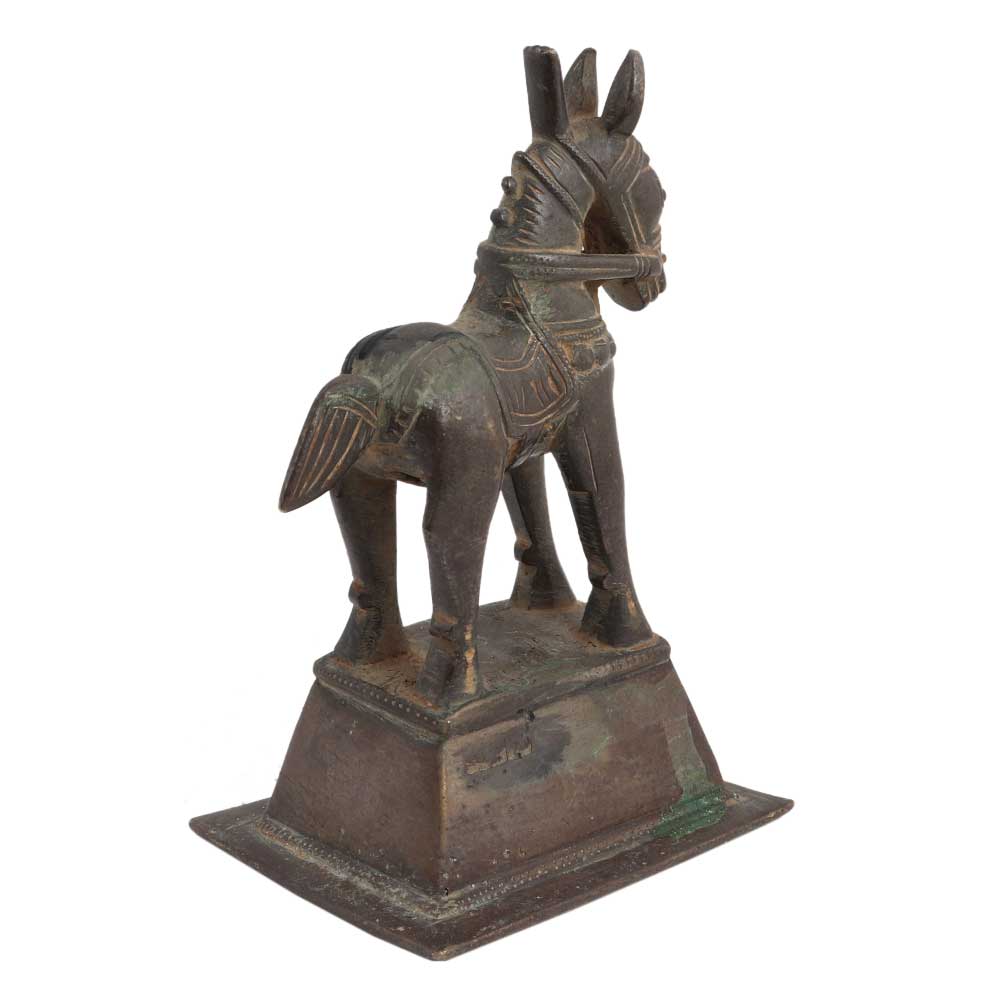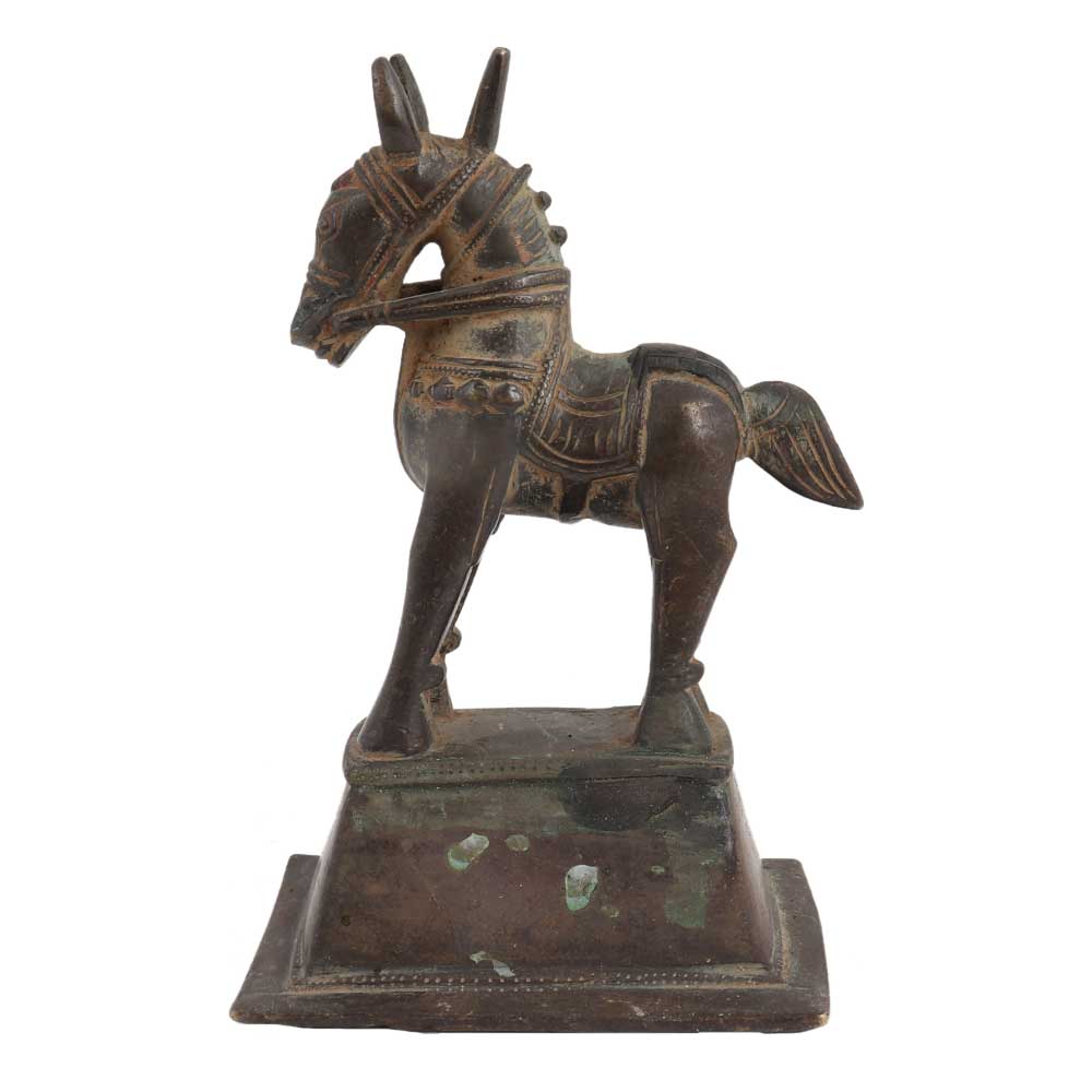 Very old used brass standing horse statue attached to a irregular rectangular base made by the tribal craftsmen of India using traditional tools which is why the statue has some rough and irregular edges. Temple toy, home decoration, showpiece, souvenir, Study Table Display, Kids room decor gift, an interesting piece of conversation, gift for horse lovers, ideal collectors item.