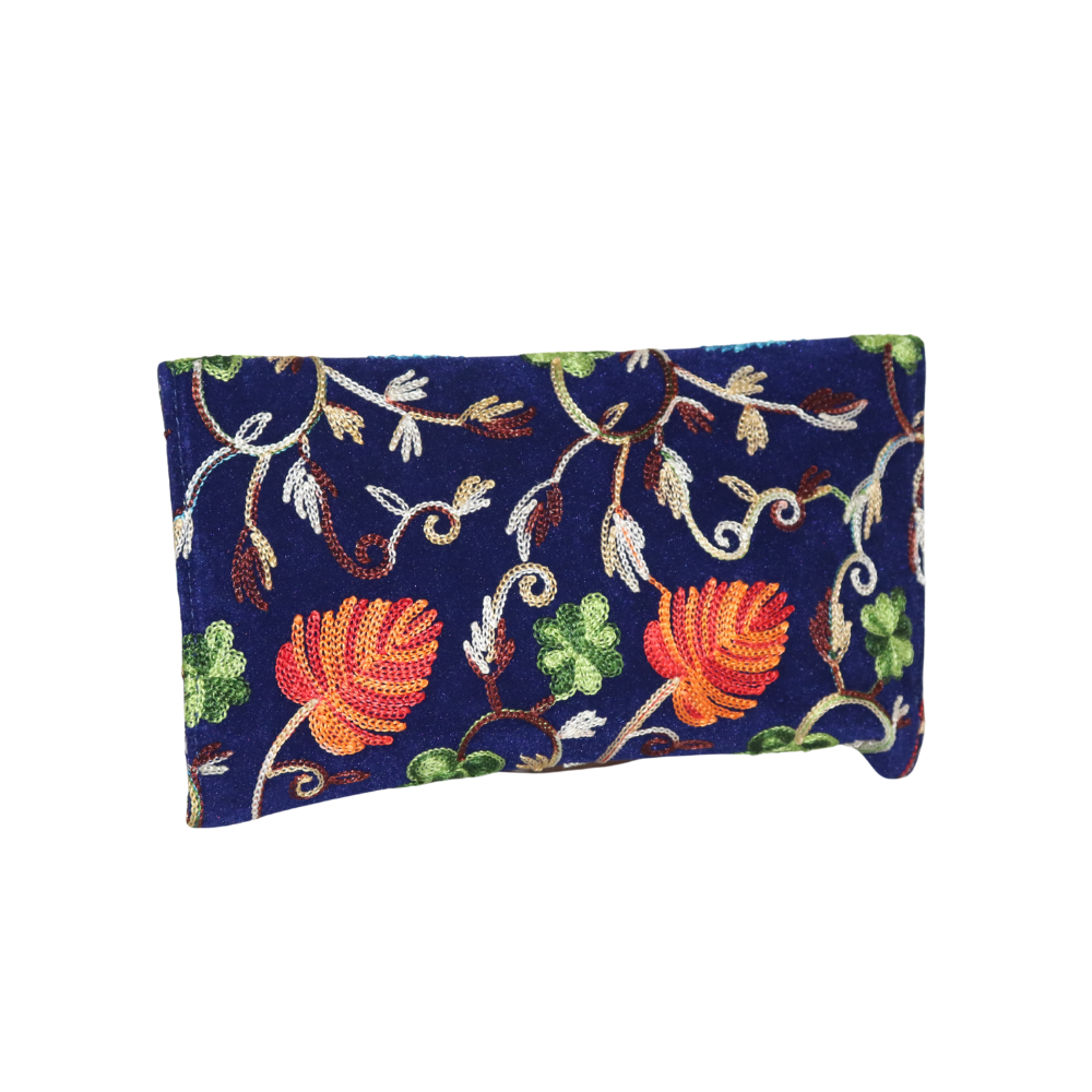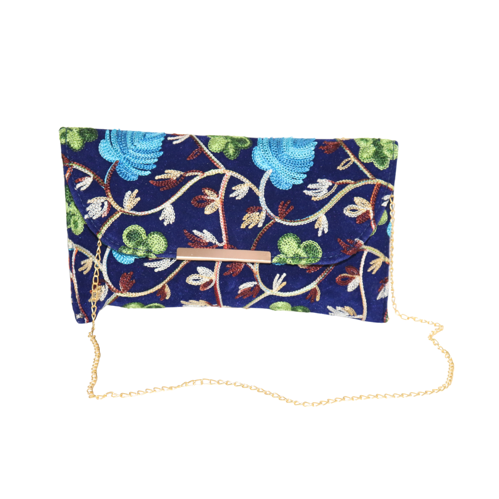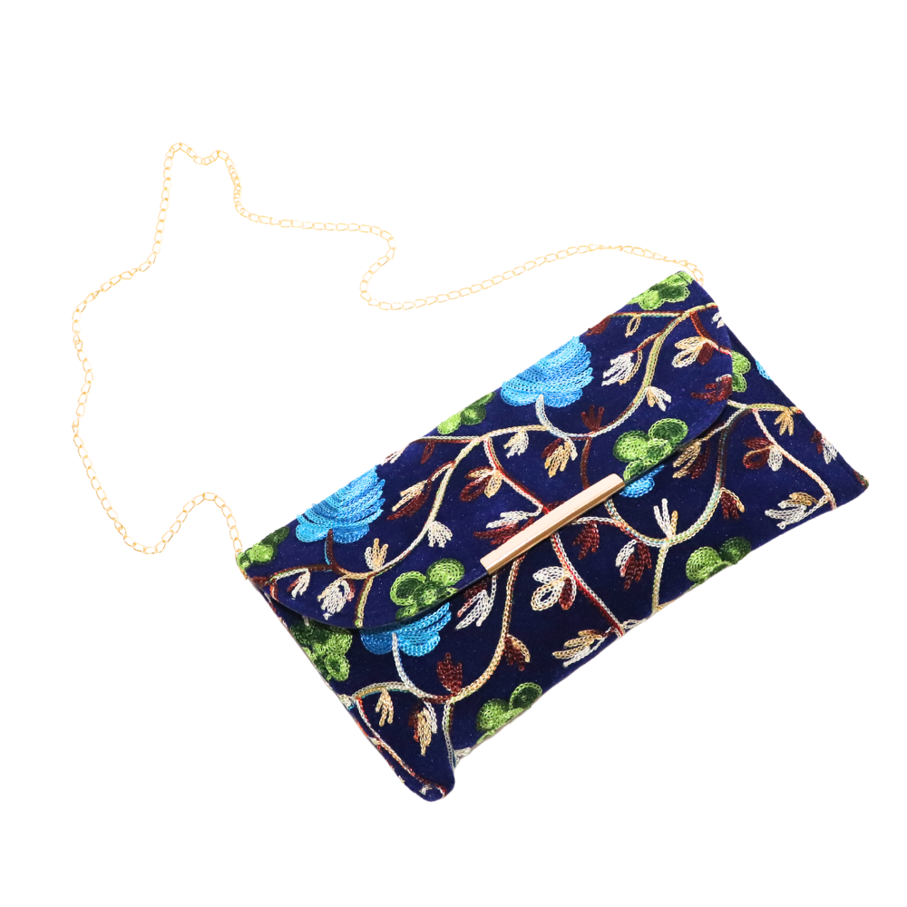 Brighten up any outfit with this handmade velvet clutch featuring intricate floral beadwork in vibrant colors. The beautiful design showcases a mix of blue, green, and gold embroidery on rich navy velvet, creating a striking contrast that makes this clutch stand out. Perfect for weddings, parties, or casual evening events, this clutch offers both style and function. The durable gold chain strap provides easy and comfortable carrying, while the compact interior holds your essentials, including a phone, cards, and makeup. This handcrafted accessory combines luxury, artistry, and practicality in one stunning piece. Whether dressing up for a special occasion or adding a pop of color to a more casual look, this clutch will be the perfect companion. Its timeless appeal and vibrant design make it a must-have accessory for anyone looking to make a statement.
