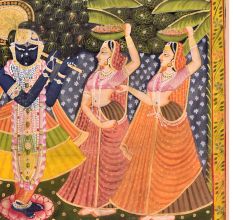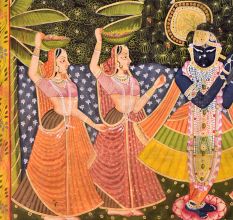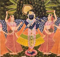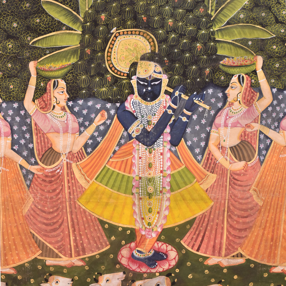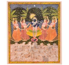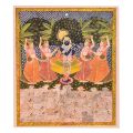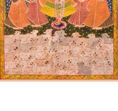This intricately painted Pichwai depicts Lord Krishna playing his flute in the centre, surrounded by four beautiful females holding baskets on their hands, and numerous cows listening to the enchanting melody of his flute. The painting is exquisitely crafted on fabric cloth by professional Indian artists who have used a myriad of vibrant and rich colours to bring to life the divine aura of Lord Krishna. The painting is set against a backdrop of lush bushes, which accentuate the beauty of the central characters. The intricate detailing and fine brushstrokes add depth and texture to the painting, making it an ideal centrepiece for any prayer room or temple. This Pichwai painting is a thoughtful and auspicious gift for family, friends, or relatives on special occasions like weddings, housewarming, or festivals. It represents the divine grace of Lord Krishna, who is revered as a symbol of love, compassion, and spiritual enlightenment in Hinduism. The painting is sure to bring joy and peace to anyone who beholds its beauty and grace.