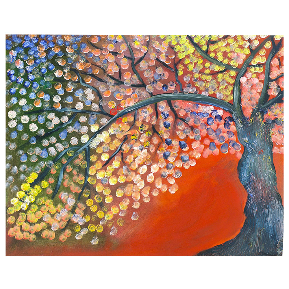 This striking oil painting on canvas captures the poetic elegance of a tree in full bloom, set against a vibrant sunset-hued backdrop. The artist uses bold strokes and a unique stippling technique to create a canopy of multicolored blossoms—ranging from soft pinks and warm yellows to cool blues and whites—that dance across the canvas like confetti in motion. Each dab of color forms a delicate bloom, adding depth, rhythm, and texture to the composition. The strong, twisting branches and richly detailed bark in deep shades of blue and charcoal provide a grounding contrast to the explosion of colors above. The fiery orange-red background evokes the warmth of a setting sun, infusing the entire piece with energy and emotion. This artwork beautifully blends realism with abstraction, making it a captivating centerpiece for any modern or eclectic interior. It celebrates nature’s ever-changing beauty through a lens of imagination and vibrant expression.