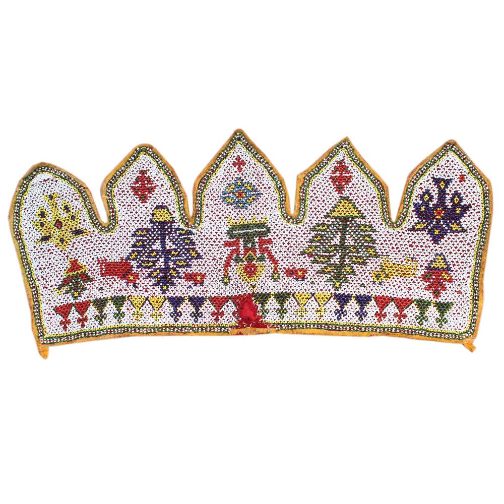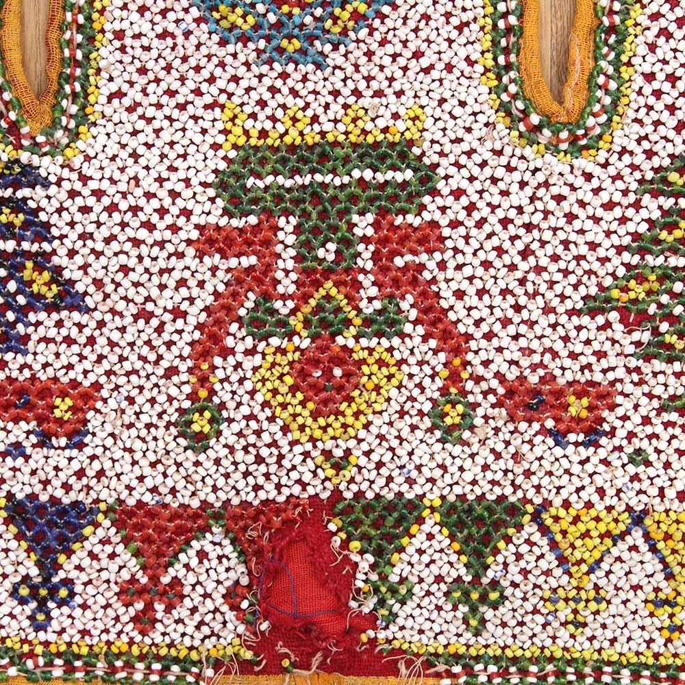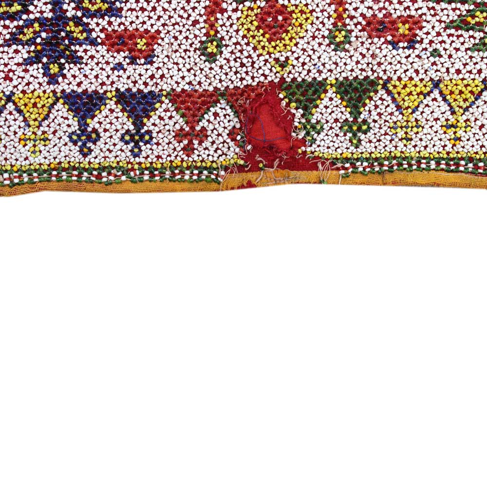 Vintage Beaded Toran entrance hanging from Gujrat shows lord Ganesh, the popular elephant Deity who brings good fortune, is shown in the focal theme. He is surrounded by floral and good luck symbols. The hanging would have been used to decorate a bridal cart or hung above a door for special events.