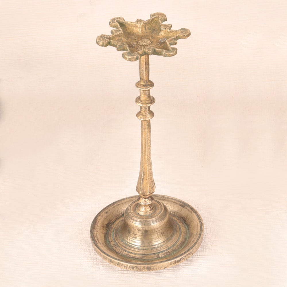 This Vintage Brass Oil Lamp is a true masterpiece painstakingly handcrafted by talented Indian artisans in the timeless South Indian art tradition. This remarkable piece exudes the charm of antiquity, featuring a rich antique brown finish that beautifully accentuates the high-quality brass used in its creation. Versatile in its application, this brass oil lamp is a captivating addition to any setting. Whether you place it in your home, office, restaurant, hotel, shop, cafe, or prayer room, it effortlessly adds an aura of elegance and spirituality. It's not only a symbol of divine reverence but also a splendid decorative item, making it an ideal choice for both vintage collectors and display at exhibitions. What sets this lamp apart is its ability to hold six jyots simultaneously, each illuminating with the warm glow of mustard oil or ghee, using traditional cotton wicks. This feature makes it perfect for special, festive, or auspicious occasions, where its radiance can bring a sense of serenity and festivity to your surroundings.