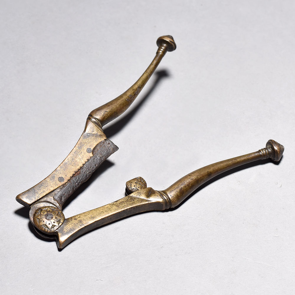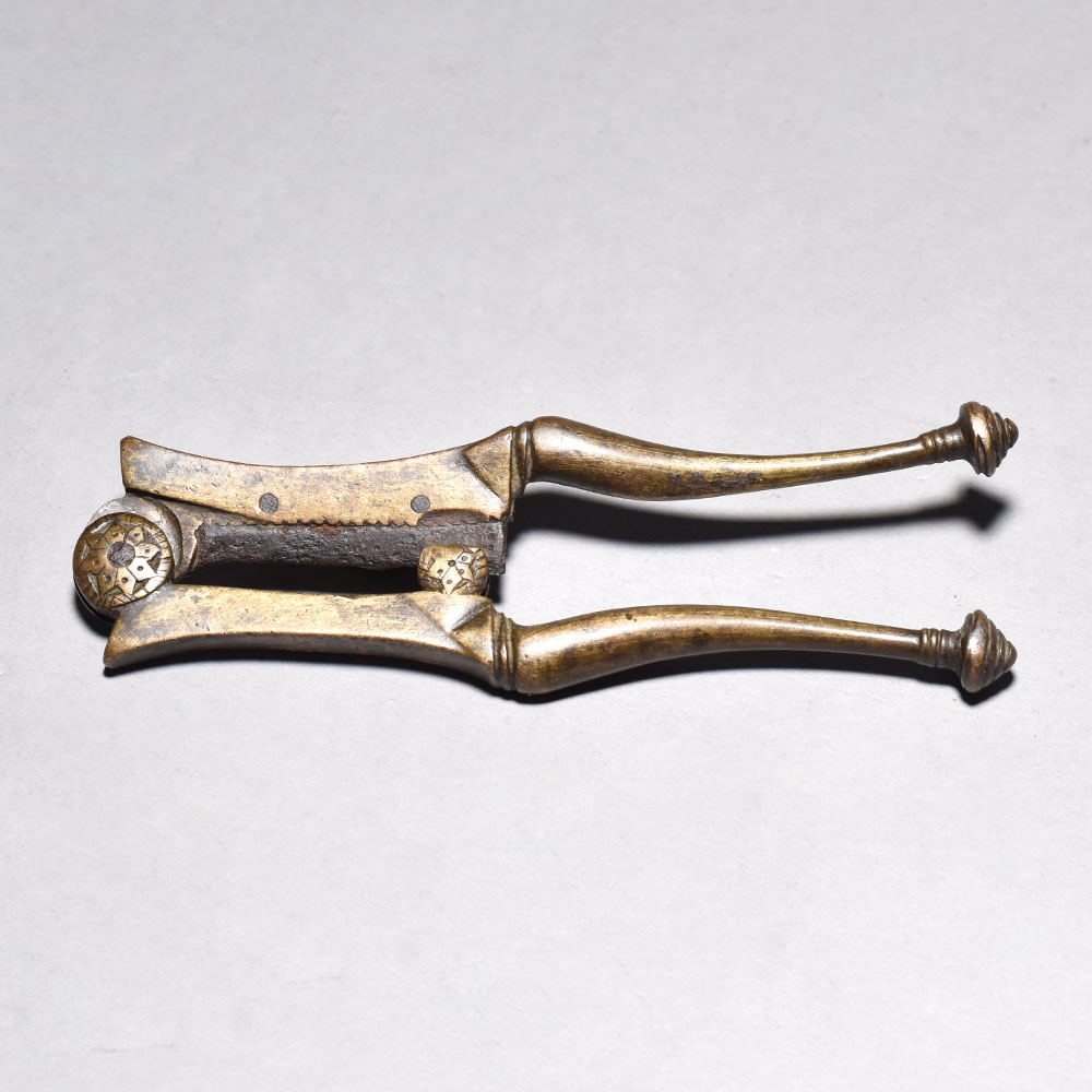 Unlock the secrets of the East with this stunning Vintage Betel Nut Cutter. Crafted from durable brass iron, this traditional tool features a central cutting blade and two long handles - the signature design for effortlessly slicing open betel nuts.