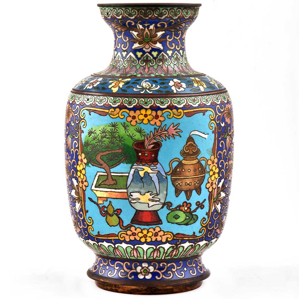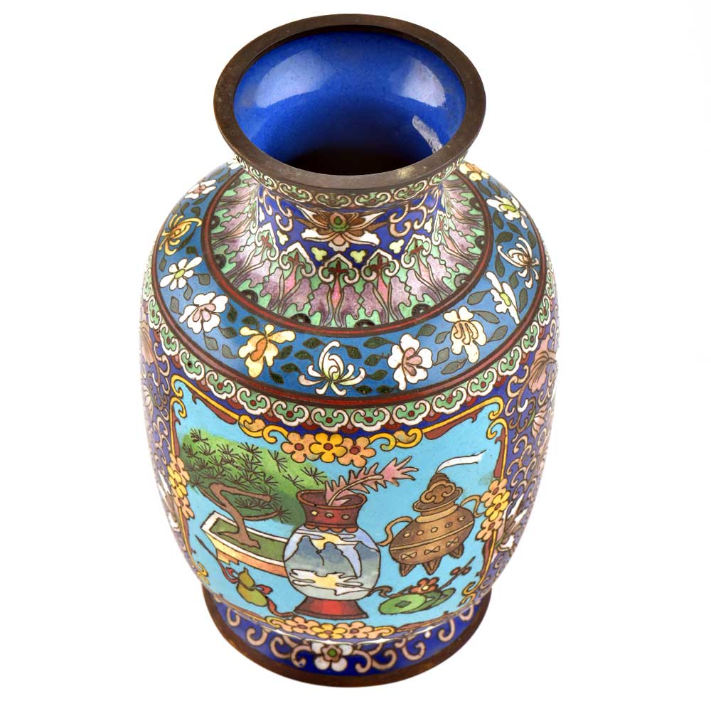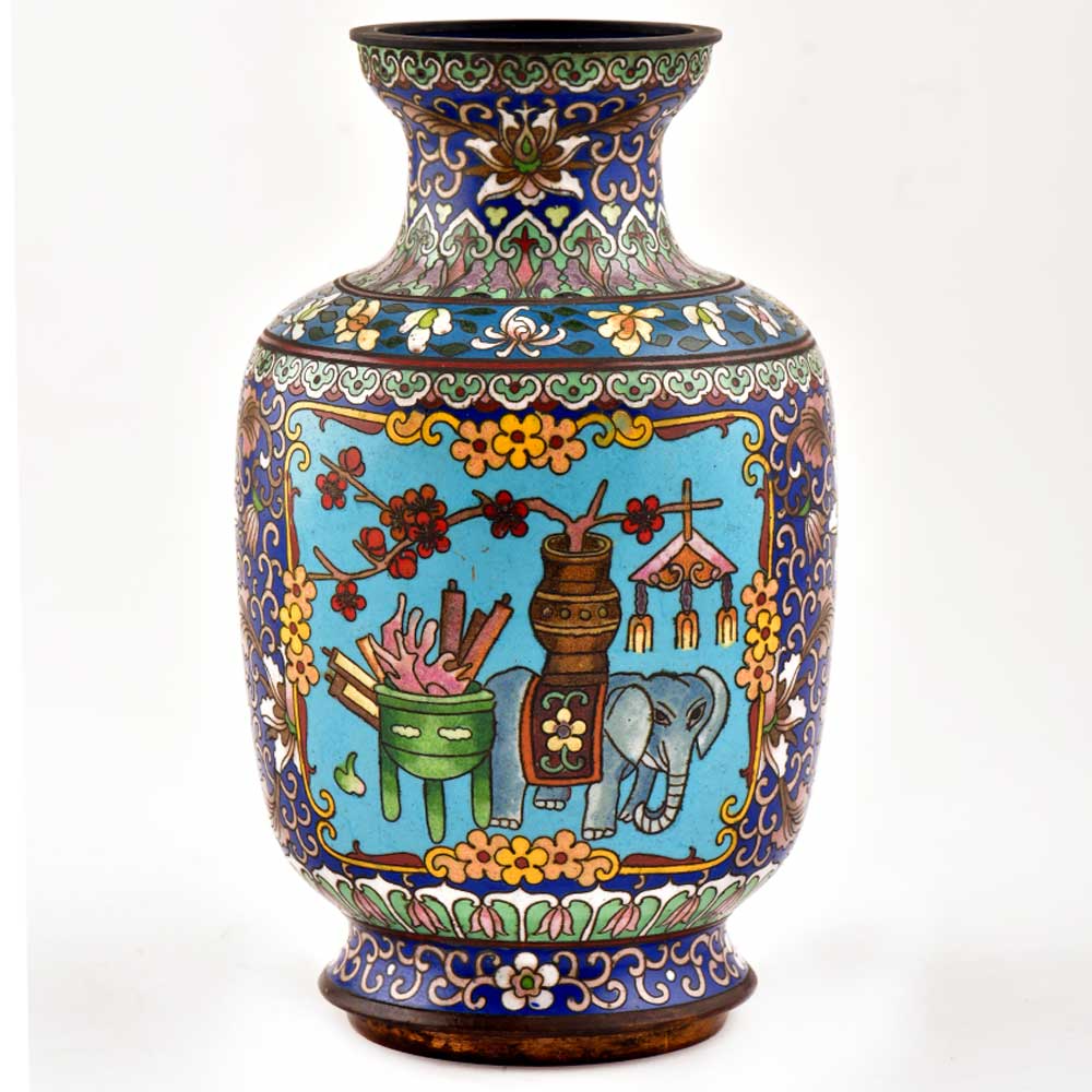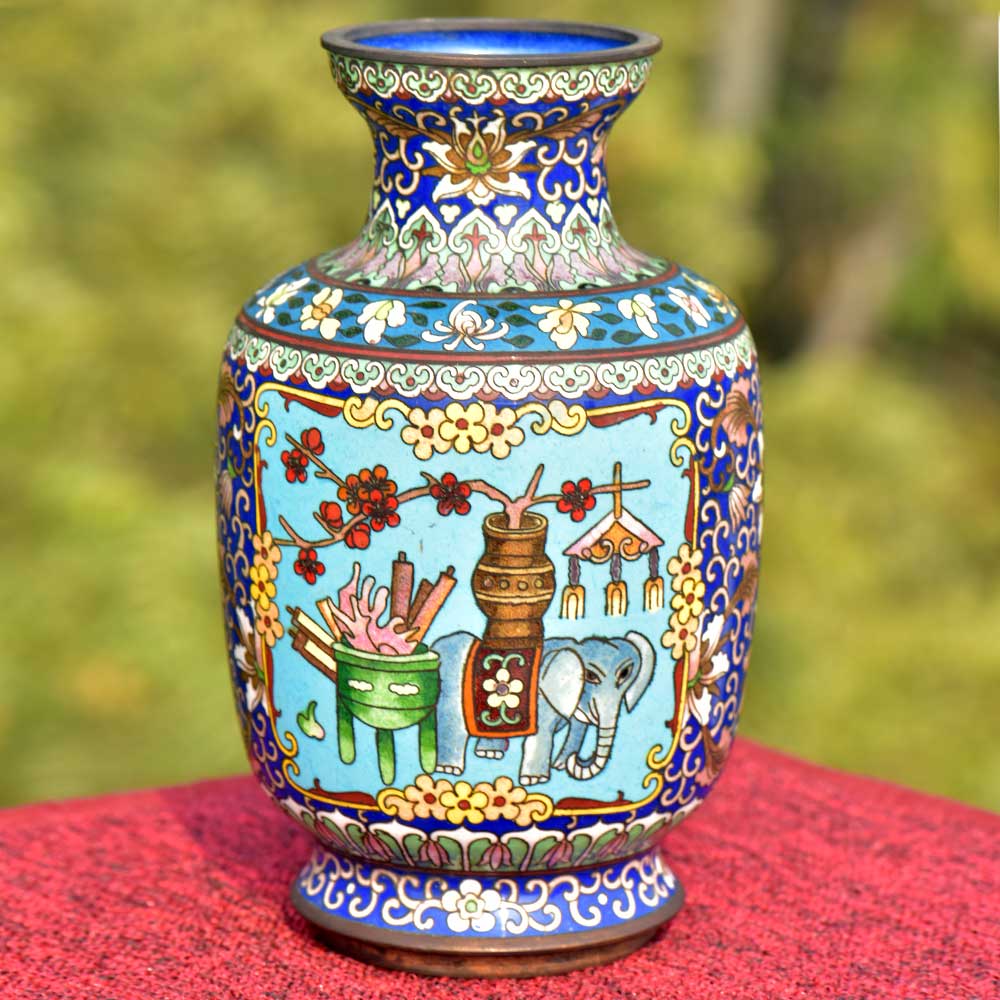 Decorative enameled metal ware called cloisonné exhibit almost superhuman skill by master craftsmen displayed by the marvelous diversity, intricacy and beauty of their designs. This metal Cloisonne Vase hand painted in blue in different shades of blue with an elephant in tribal style and a traditional stove and rolling pins and other rural things in the background makes it looks very classy .