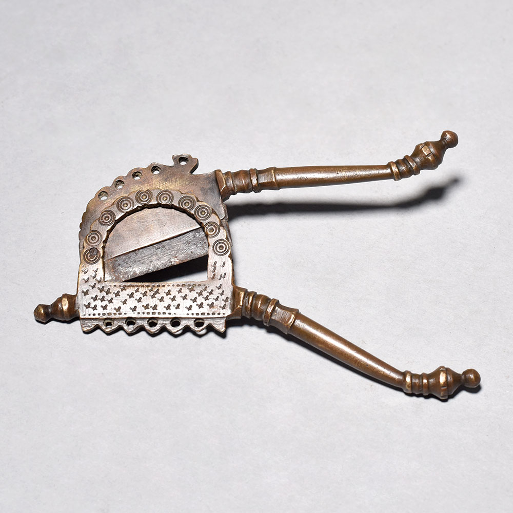 Unlock the rich cultural heritage of India with this stunning vintage betel nut cutter. Crafted from durable brass and iron, this time-honored tool is a functional work of art.