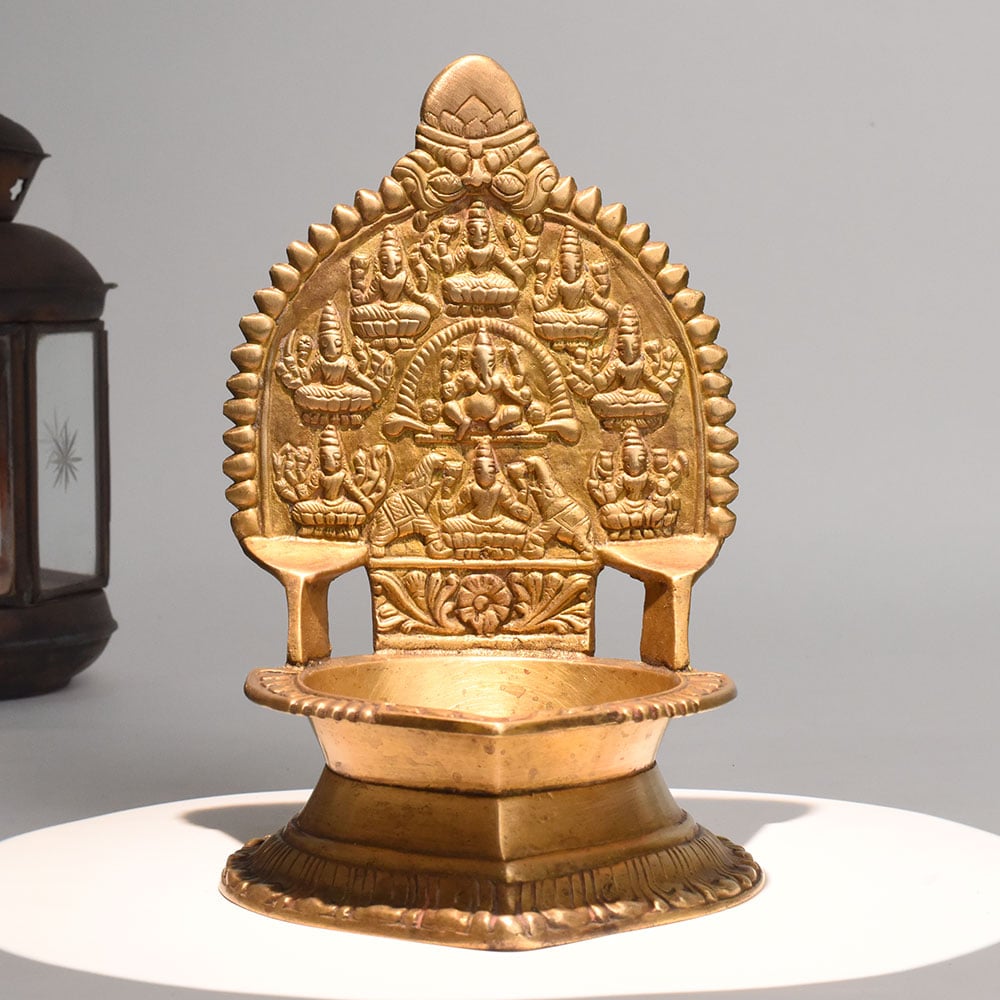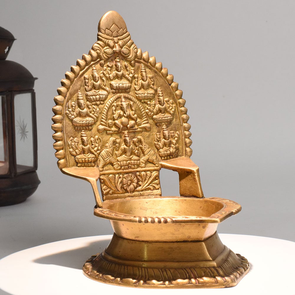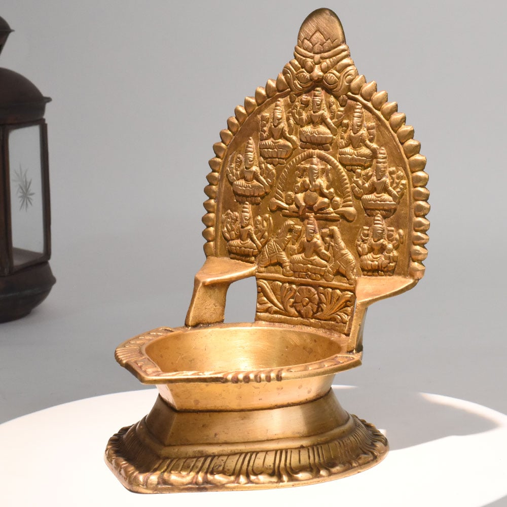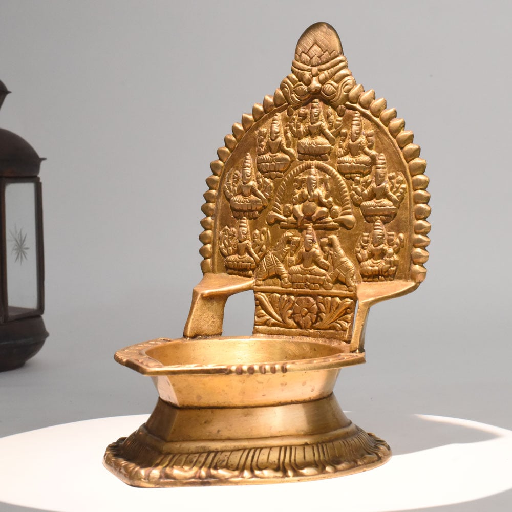 - Handcrafted solid brass Ashtalakshmi diya oil lamp Eight forms of Goddess Lakshmi in intricate relief Ideal for daily worship and festive rituals Antique vintage finish with traditional detailing
