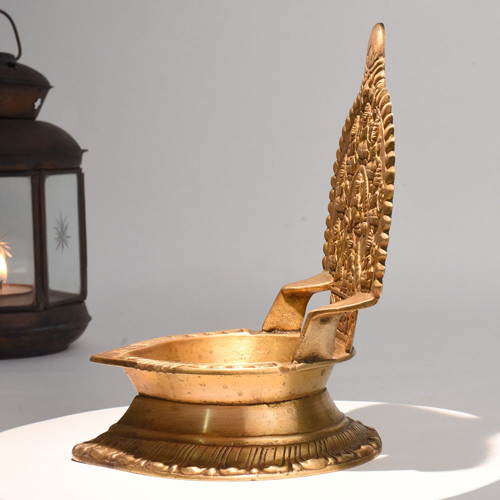 This vintage brass Ashtalakshmi Diya oil lamp is a sacred blend of devotion artistry and timeless tradition. Handcrafted by skilled artisans this lamp features detailed relief carvings of Ashtalakshmi the eight divine manifestations of Goddess Lakshmi, symbolizing prosperity wealth wisdom strength health fertility courage and success. The ornate arched backplate and symmetrical composition reflect classical South Indian temple design. Crafted from solid brass this diya is built for durability and long term ritual use. The deep oil bowl provides steady illumination while the sturdy base ensures stability during daily puja and festive ceremonies. Its warm antique finish enhances its heritage appeal making it an elegant addition to home temples prayer rooms and traditional interiors. Lighting this Ashtalakshmi diya is believed to invite abundance harmony and positive energy into the home. It is ideal for Diwali Lakshmi Puja Navratri and special religious occasions. This lamp also serves as a meaningful spiritual gift for weddings housewarmings and devotional celebrations. A true collector piece it preserves cultural heritage while enriching spiritual practice.