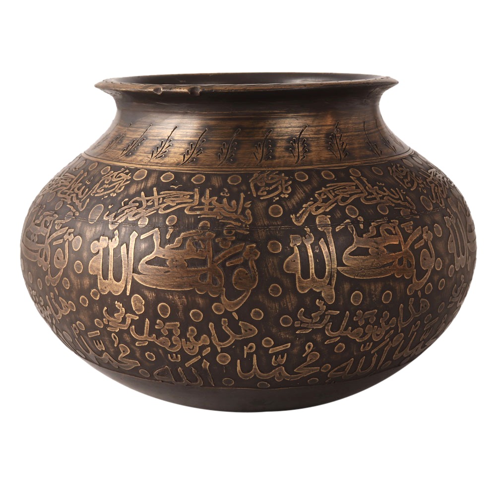 A vintage cooking pot made of brass. It was carved by skilled Indian craftsmen in Islamic art. It has beautiful designs carved on its surface. Put it as a flower pot in your garden, house, restaurant or hotel to beautify the interior. It has an antique finish that will be an eye-catcher for your guests in your home. A decorative vintage piece of art for your vintage collection. Enhance your vintage collection. An ideal gift for special occasions for your loved ones.
