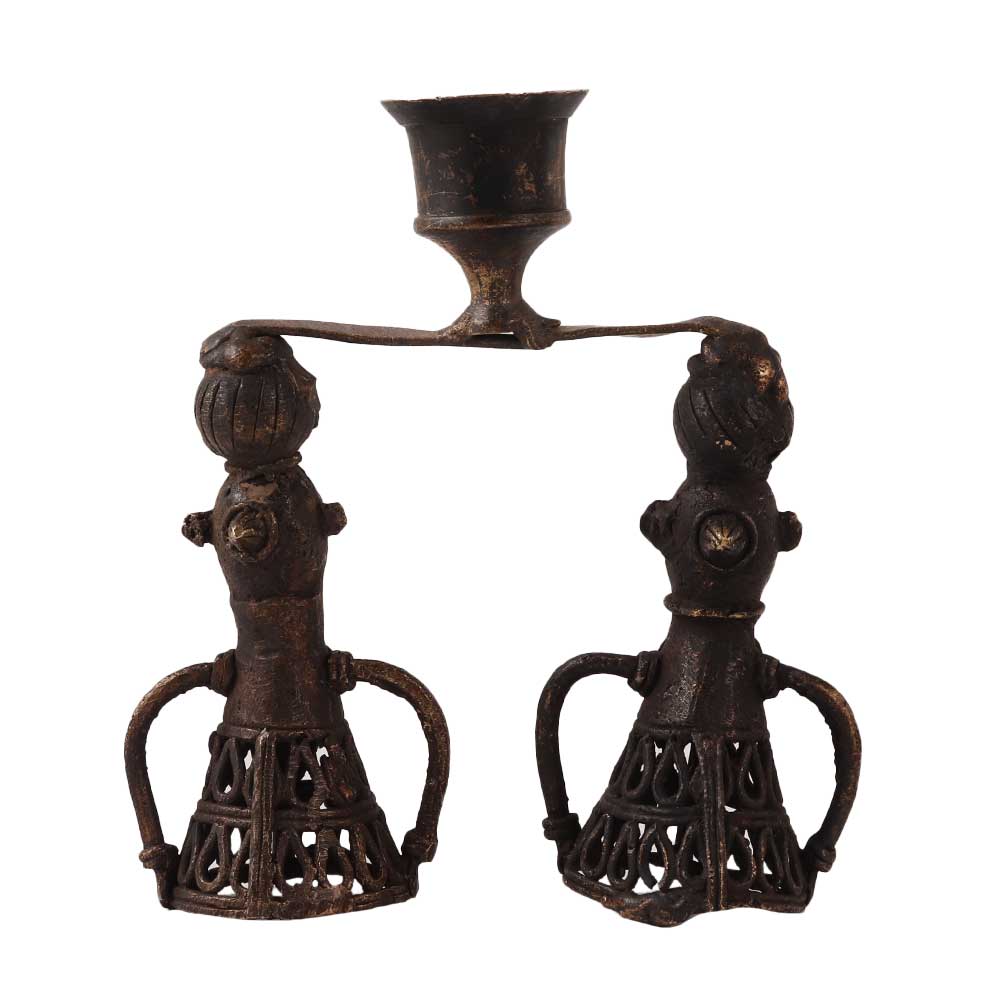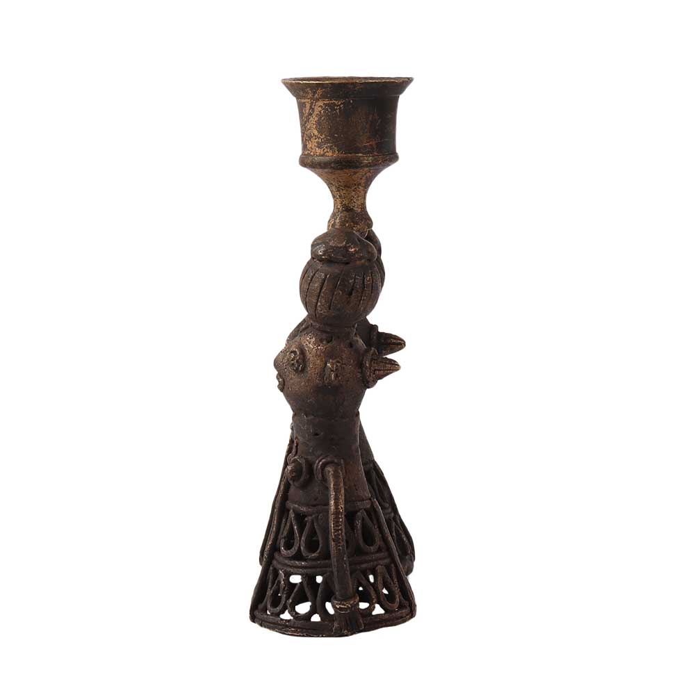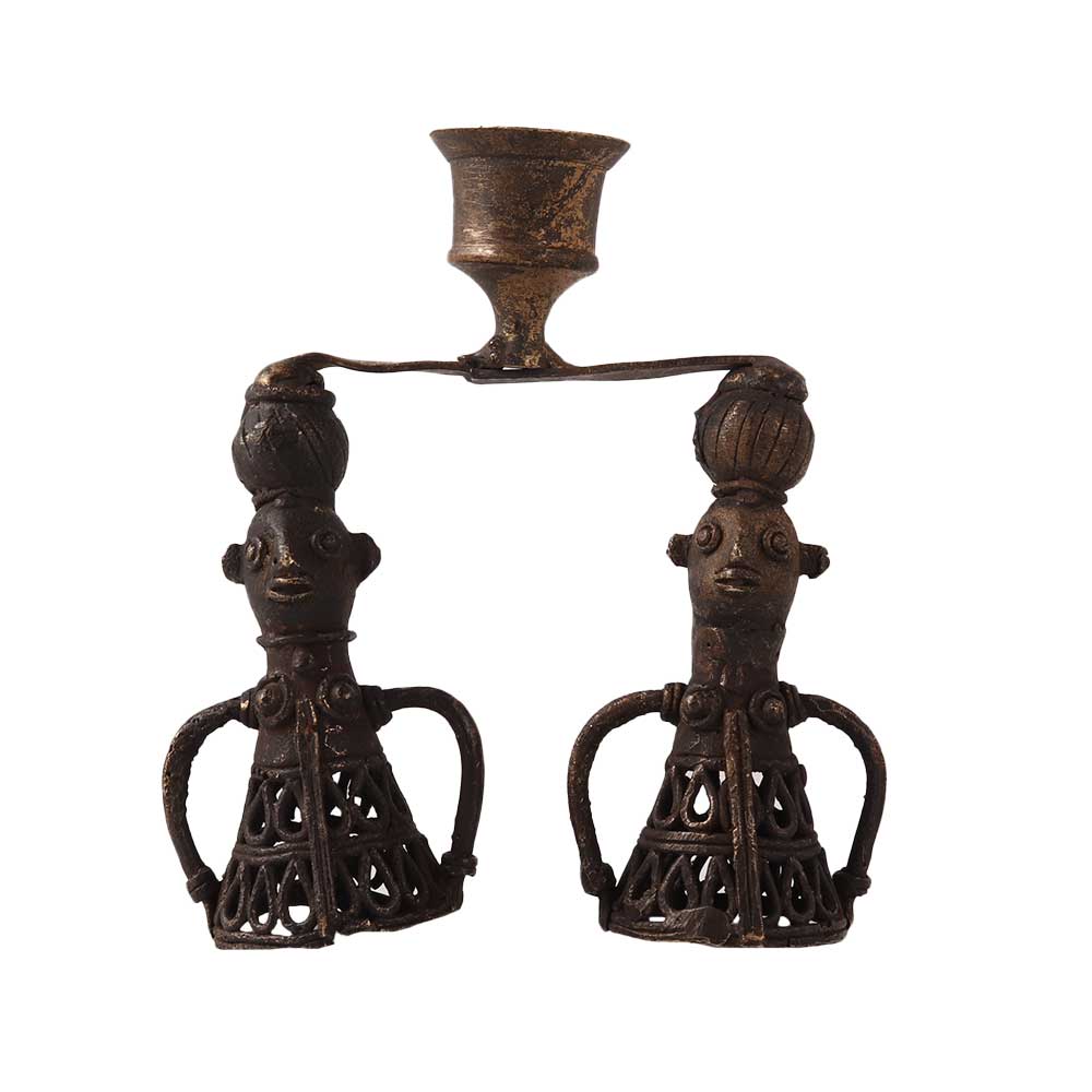 An alluring vintage style folk art candle holder with an eye-catching appearance for your visitors and guests. This antique dark brown finish candle stand with two standing dolls is handcrafted from pure brass by skilled artisans. Add a touch of glamour to your home and office decor with this alluring candle stand. Its unconventional design makes it a treat for vintage collectors and decor experts. Place this beautiful artefact on your study or dining table or on a shelf and use it as a candle holder for dinner, a special occasion or a blackout. A perfect gift for any special occasion for your near and dear ones.