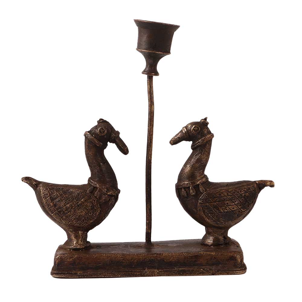 An exquisite candle stand for home and office decoration. This handcrafted brass candle stand with two ducks is carved from high quality brass. This brass candle holder has an antique dark brown finish to enhance the interior decoration of home, office, restaurant, stage or hotel. Brass candle holders have been used to decorate homes for centuries. Add this beautiful collectible and incredible item in your vintage art collection or gift your friends, family or relatives on special occasions like New Year, corporate party, anniversary, wedding or birthday and festive occasions.