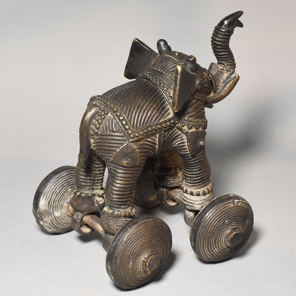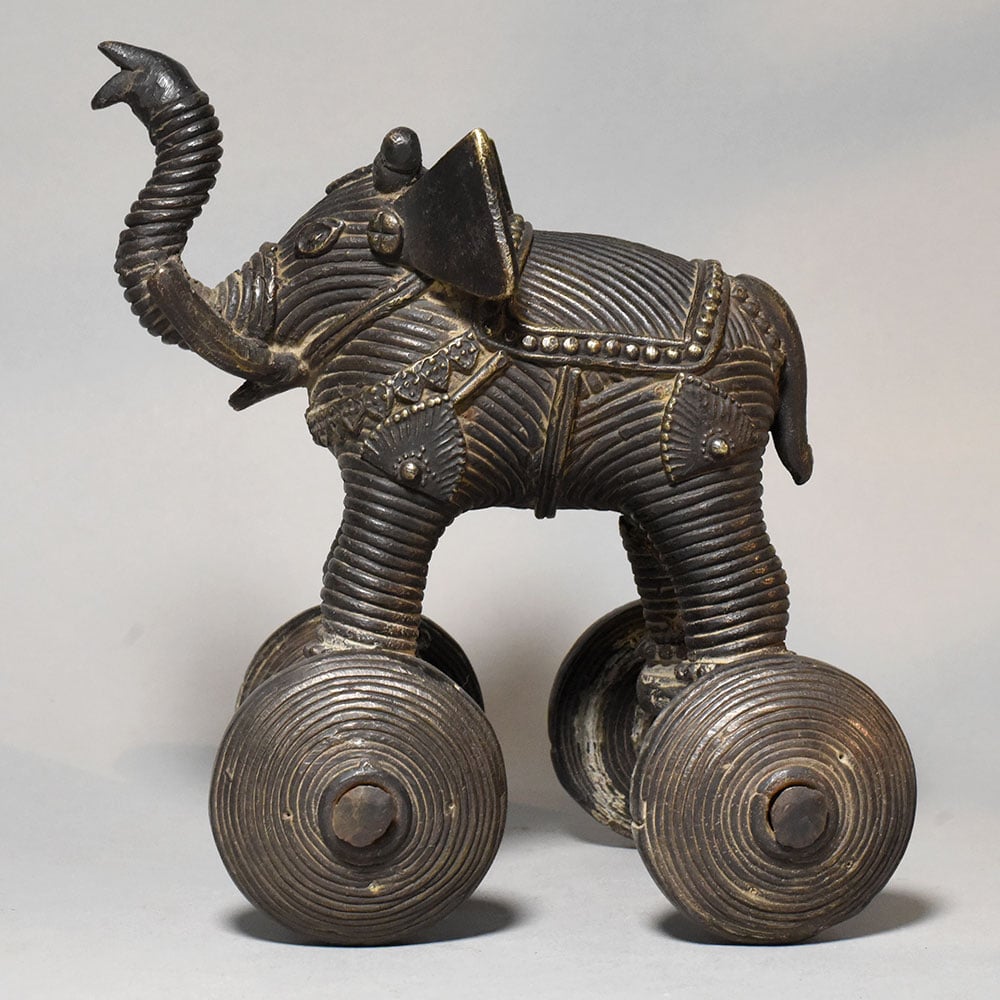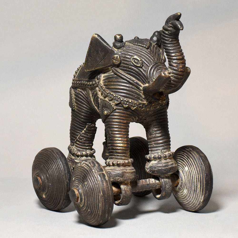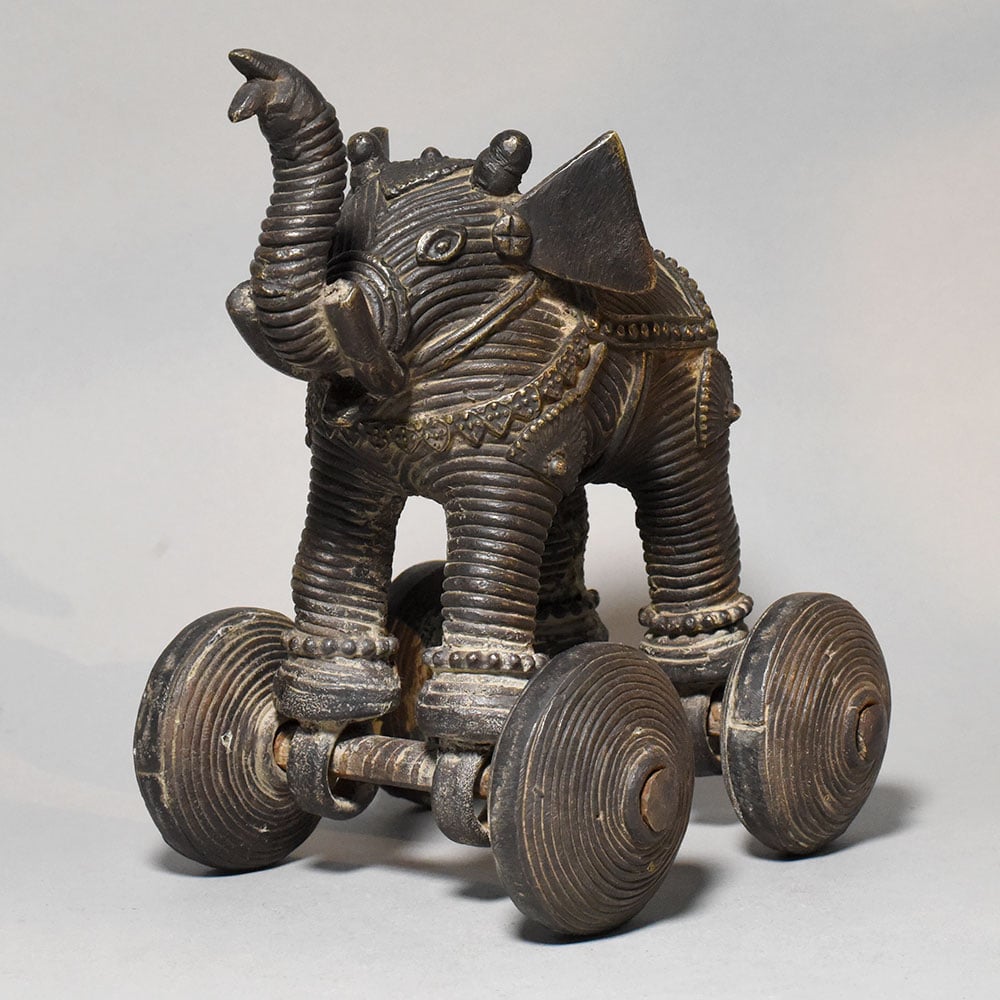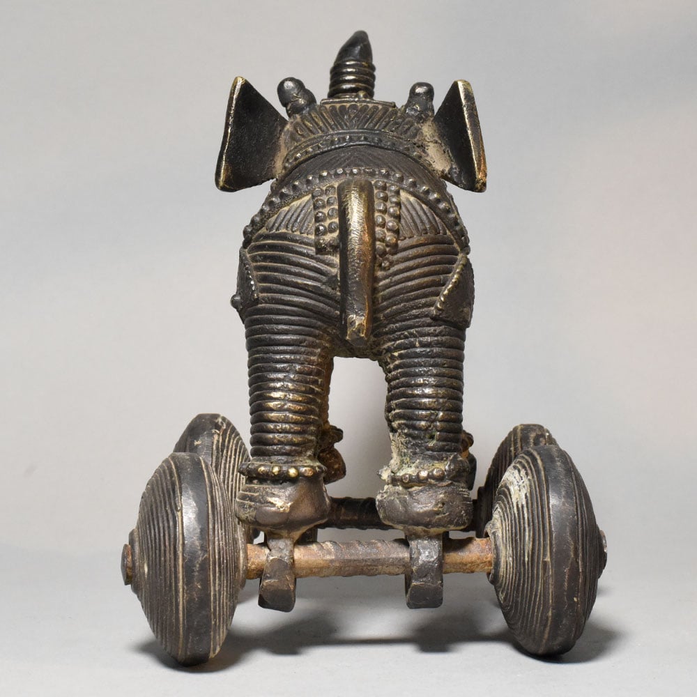 This vintage brass elephant rolling toy figurine is a charming example of traditional Indian folk craftsmanship. The piece features a stylized elephant sculpture mounted on four solid metal wheels, combining decorative artistry with a playful mechanical element. The elephant is richly detailed with engraved textures across the body, highlighting decorative harness patterns and ornamental carvings that resemble traditional elephant adornments used in ceremonial processions. The raised trunk posture symbolizes good fortune, strength, and prosperity, making elephant figures especially meaningful in Indian culture. Mounted beneath the elephant are four round brass wheels connected by metal axles, allowing the figurine to roll smoothly across a surface. Such wheeled animal figurines were historically crafted as traditional rolling toys and decorative objects, reflecting both artistic skill and playful design. The brass surface displays a deep antique patina with natural aging that enhances the carved details and gives the figurine a distinctive vintage character. The sculpted form and textured metalwork make it a visually striking collectible piece. Perfect for collectors of traditional artifacts, vintage decor enthusiasts, or heritage-themed interiors, this brass rolling elephant figurine serves as both a decorative sculpture and a nostalgic folk-art object.