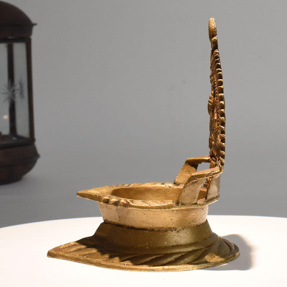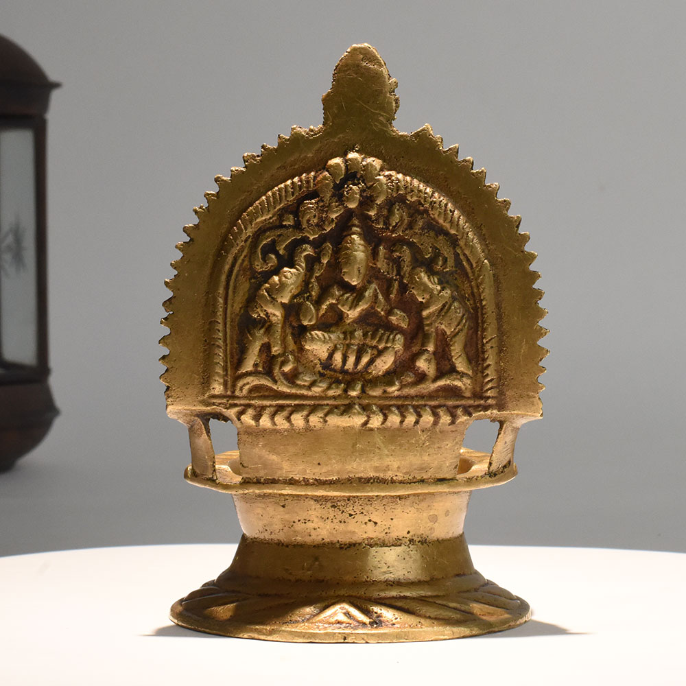 This vintage brass Gajalakshmi deepam brings a sense of timeless devotion to your worship space. Designed with a detailed carving of Goddess Lakshmi seated on a lotus with two elephants pouring blessings from above, the lamp symbolizes prosperity and divine grace. The broad oil well is ideal for long lasting illumination during daily pujas, aarti rituals, and festival celebrations. Crafted from solid brass, the lamp carries a warm antique finish that enhances its traditional aesthetic. The ornate arch and floral engravings reflect the artistry found in historic Indian temple lamps. This piece is not only functional but also serves as a meaningful decorative element, perfect for enhancing spiritual corners in homes, meditation rooms, and cultural spaces. The rich symbolism of Gajalakshmi makes it a cherished addition for promoting abundance, peace, and wellbeing. Whether used for personal worship or displayed as a cultural artifact, this vintage style lamp connects the ambiance of ancient tradition with modern devotion.