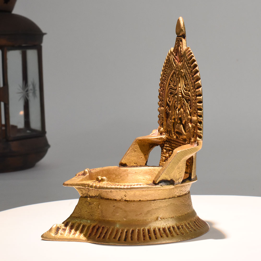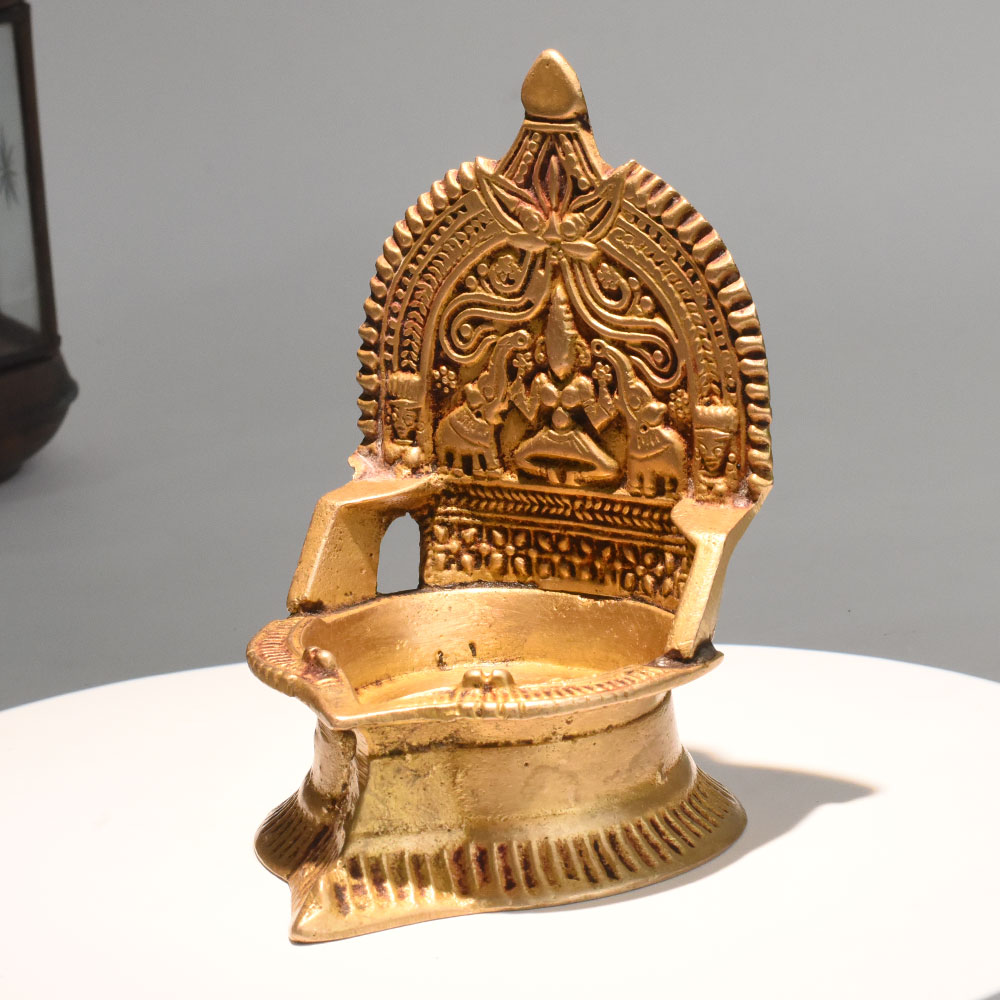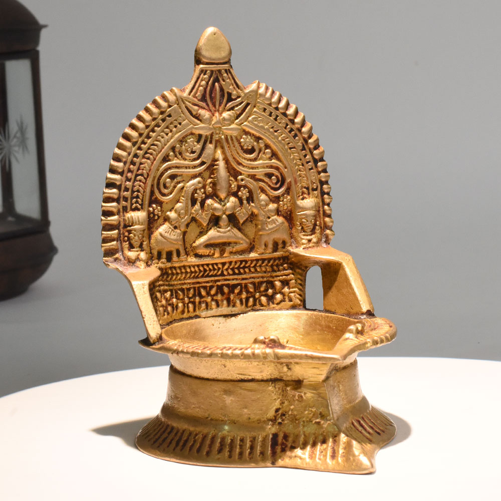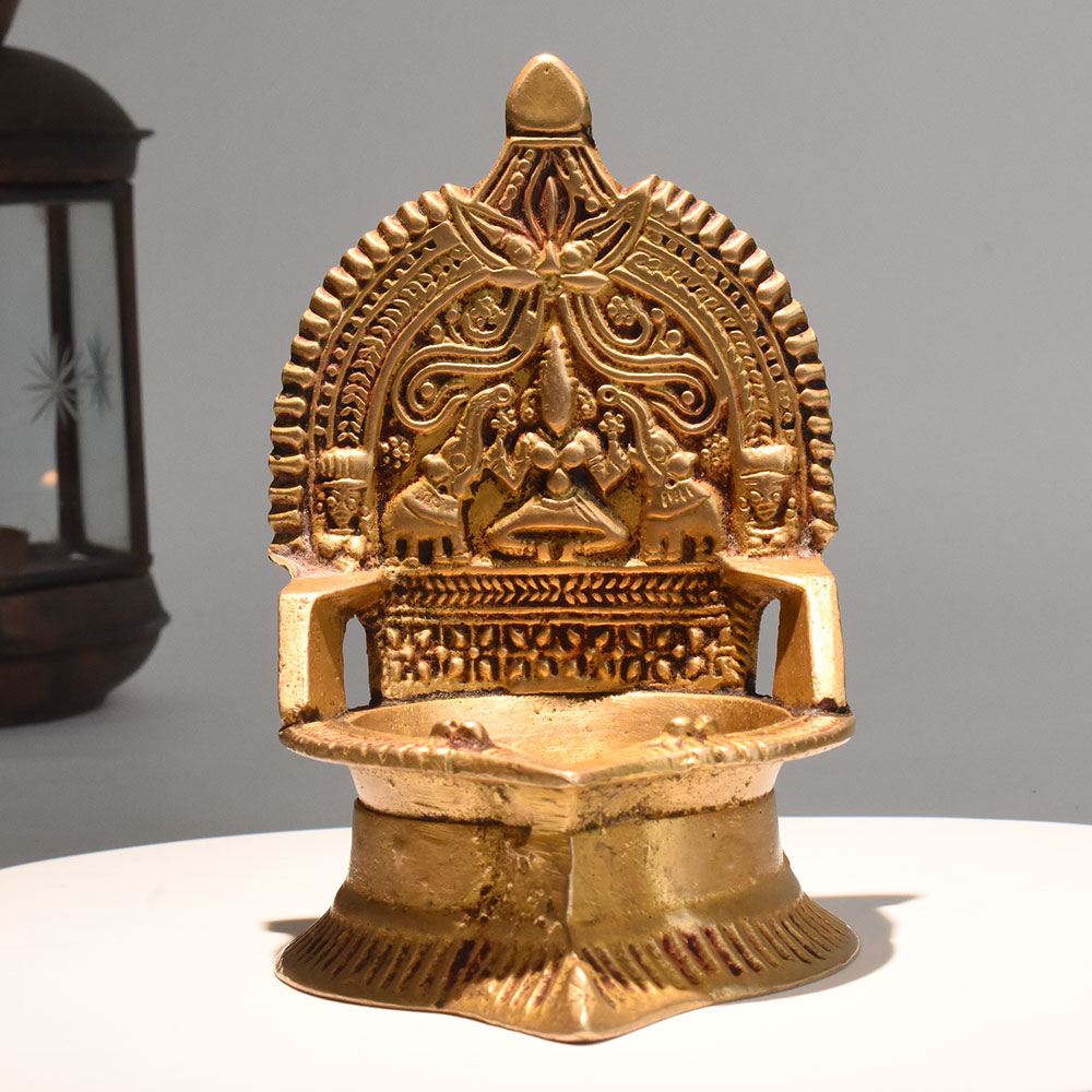 - Vintage brass lamp with detailed Gajalakshmi carving