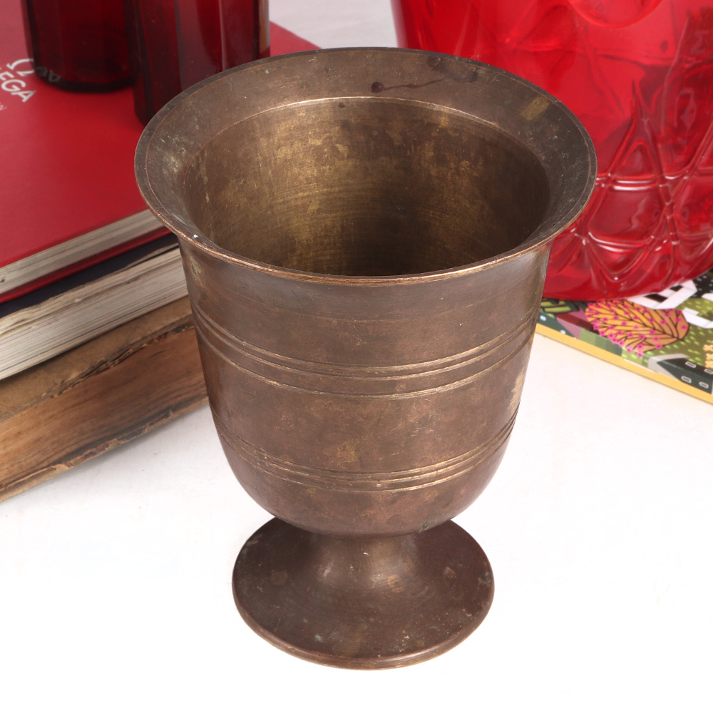 A vintage brass holy cup which is handcrafted by highly skilled Indian artisans using traditional methods. This sacred chalice is made of high quality brass, making it an eye-catching addition to your home decor. This sacred cup from the Indian state of Gujarat is an amazing piece for vintage collection and decor experts. It is used in rituals, havans and auspicious functions to store and distribute holy water among the devotees. A sleek brass cup that will add a vintage look to the interior of your home, office, restaurant or hotel. An anniversary, wedding, birthday, housewarming, Thanksgiving, New Year, Christmas, corporate party, farewell or auspicious gift for your family, friends or relatives.