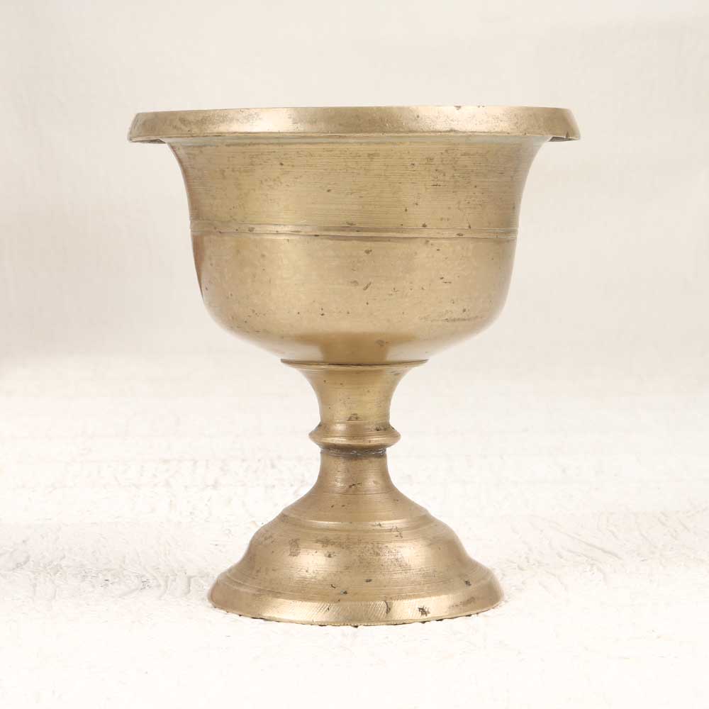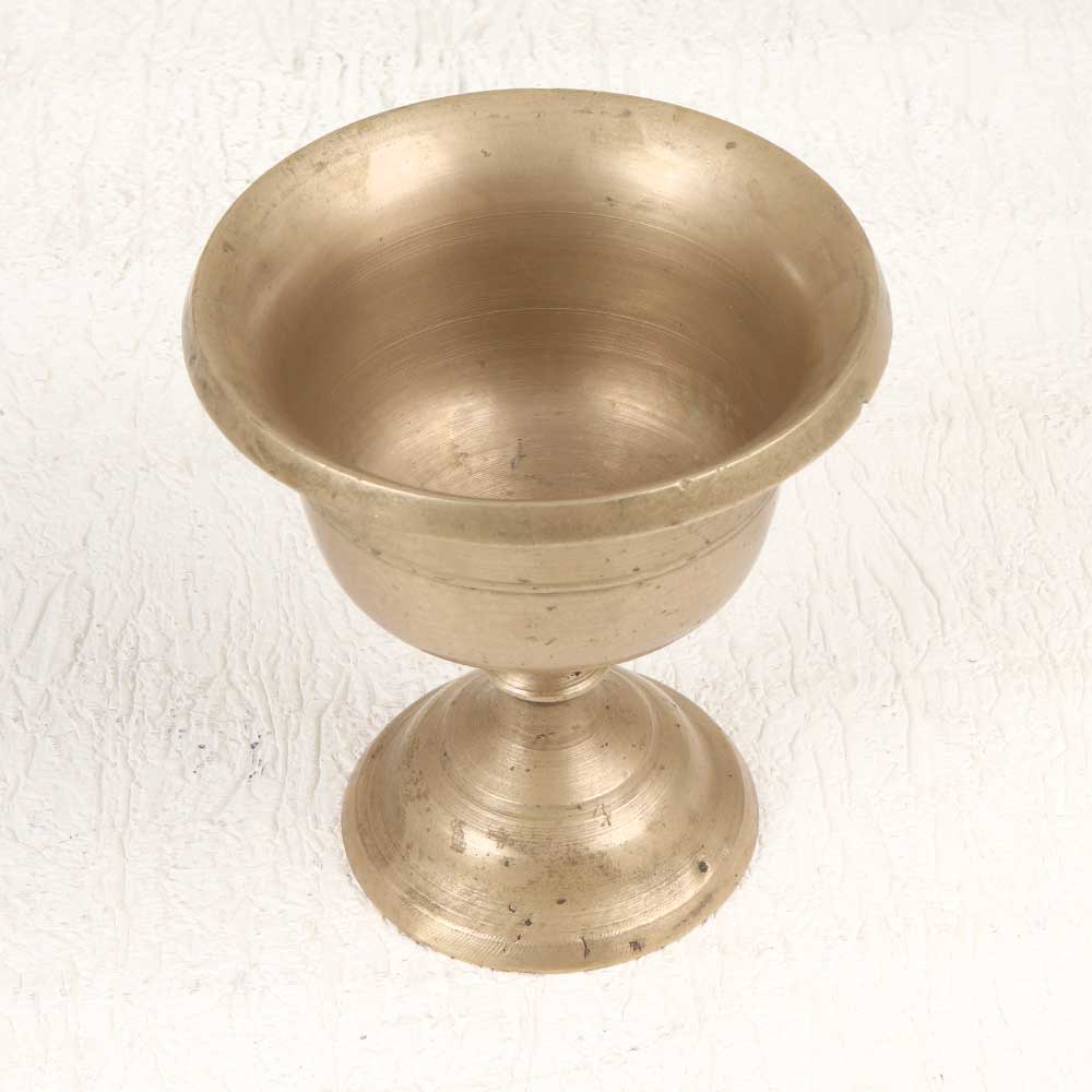 Transport yourself to ancient times with this vintage brass holy cup. Featuring intricate detailing and a stunning brown patina, this cup is perfect for pooja or display. Recreate sacred rituals with this vintage-styled brass cup. The plain brown patina lends an aged, antique look while the brass construction ensures longevity. Place it on the included stand during pooja or prayer and delight in its spiritual aura. After use, display it in your home as decor that provides a glimpse into the past. With its unique vintage design, this cup connects you to history and tradition. Bring meaning and purpose into your home with this pooja cup. Ideal for people who observe religious rituals or want to incorporate spiritual decor elements. The vintage styling provides an authentic old-world feel.