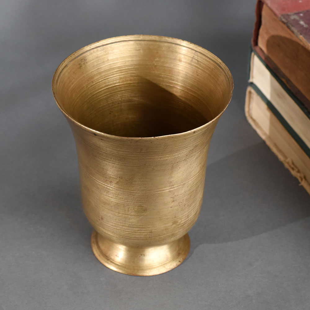Infuse your rituals with tradition and grace using this Vintage Brass Holy Water Glass, a beautifully handcrafted tumbler ideal for pooja and daily spiritual practices. Made from solid brass, this glass features a flared rim and a rounded base, offering a classic and functional design. The smooth texture and natural aged patina give it an authentic vintage appeal, perfect for home temples, altars, or religious ceremonies. Whether used for storing holy water, offerings, or simply as a spiritual decor item, this brass glass symbolizes purity and devotion in every detail.