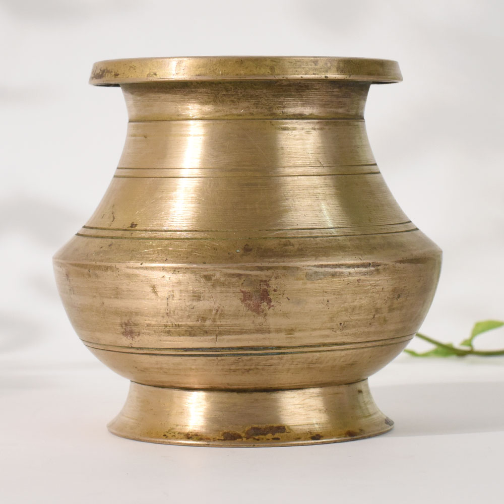 Bring home a touch of timeless South Indian heritage with this vintage brass holy water pot, traditionally known as a lota or kalash. Handcrafted by skilled artisans, this vessel reflects classic South Indian design, featuring smooth contours, engraved lines, and a rich golden patina developed over decades. Its sturdy brass construction not only enhances its durability but also adds a sacred aura, making it ideal for religious rituals, dcor, and cultural collections. This antique brass pot was traditionally used to store holy water during puja ceremonies, symbolizing purity and divine energy. Today, it serves as a meaningful collectible that blends spirituality with artistic craftsmanship. Whether displayed in a prayer room, used as a dcor accent, or gifted to lovers of vintage Indian artifacts, this handmade piece offers authenticity and cultural depth.