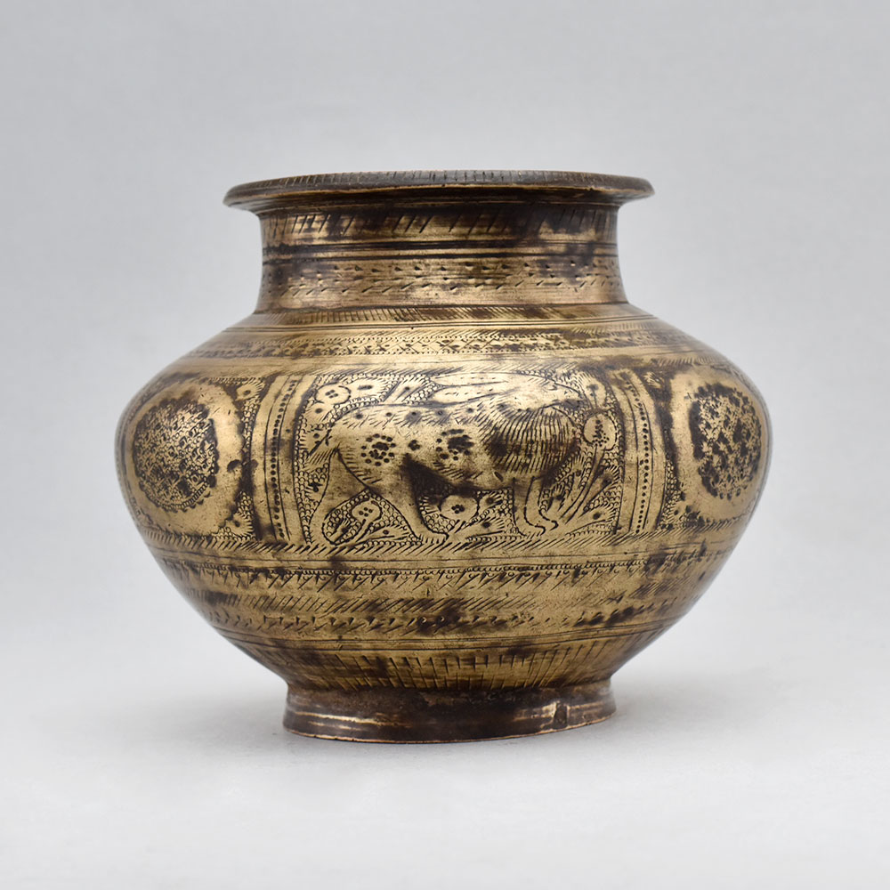 Elevate your sacred space with this exquisite vintage holy water pot, a stunning work of art that commands attention.This breathtaking holy water pot is more than just a functional piece - it's a captivating work of art that will transform any room into a serene, spiritual oasis. The intricate carvings of majestic animals create an aura of reverence, making this the perfect addition to your meditation space, altar, or living room. Whether used for its intended purpose or as a unique decorative accent, this vintage pot will elevate your decor and connect you to a rich cultural heritage. Crafted from durable brass Features intricate, fine carving work of elephants, deer, and lions Can be used for holy ceremonies or as a decorative flower pot Rounded shape with a flared rim for elegant display