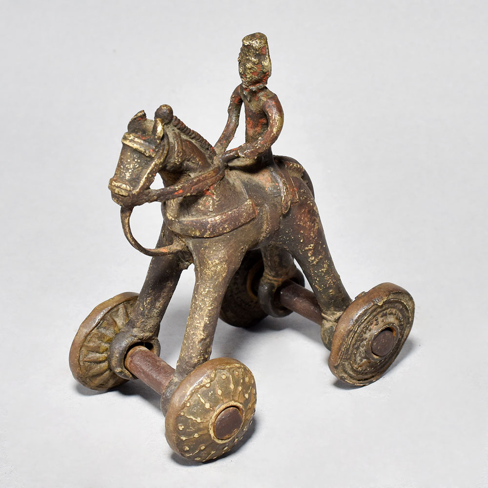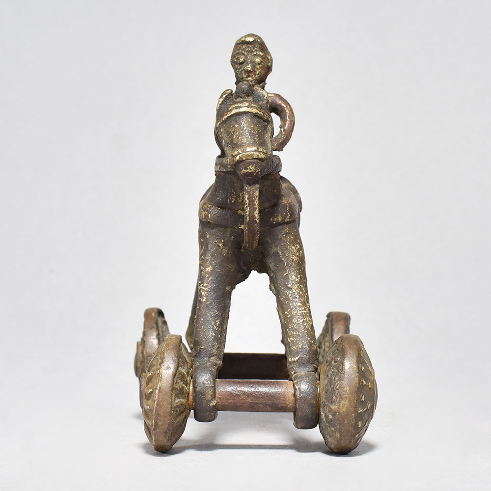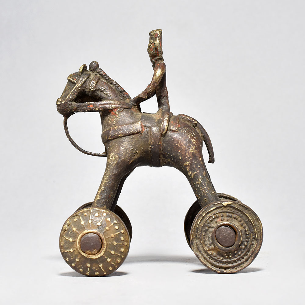 Bring the romance and elegance of a bygone era into your home with this exquisite Vintage Horse on Wheels with Rider.This charming piece is a true testament to the skill and artistry of India's rich cultural heritage. Display it as a conversation-starting centerpiece or give it as a one-of-a-kind gift that will be cherished for years to come. Handcrafted in brass by master artisans in central India Intricate, playful design captures the timeless charm of historical craftsmanship Horse features a detailed harness and working wheels for a touch of whimsy Rider sits proudly atop, creating a captivating scene This unique handcrafted piece is a testament to traditional artistry, blending functionality with beauty and making it a treasured collectible for years to come. This unique handcrafted piece is a testament to traditional artistry, blending functionality with beauty and making it a treasured collectible for years to come.