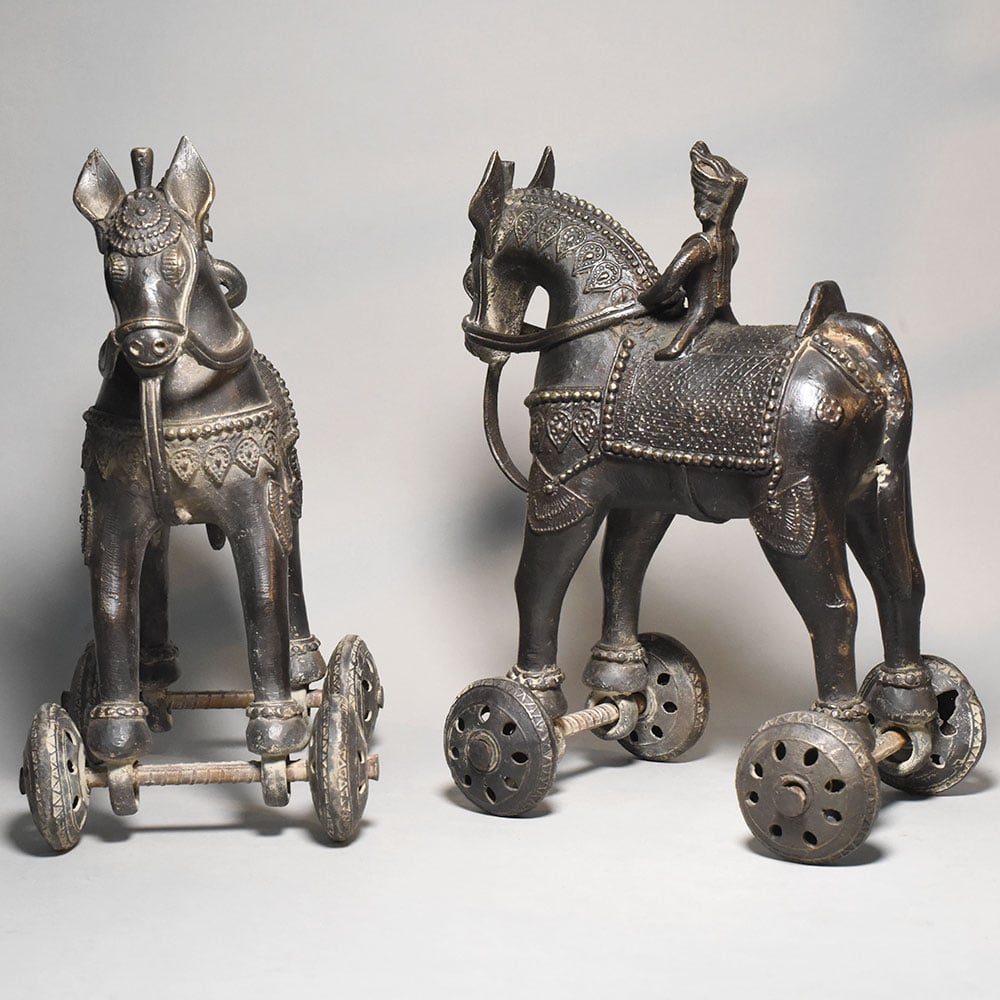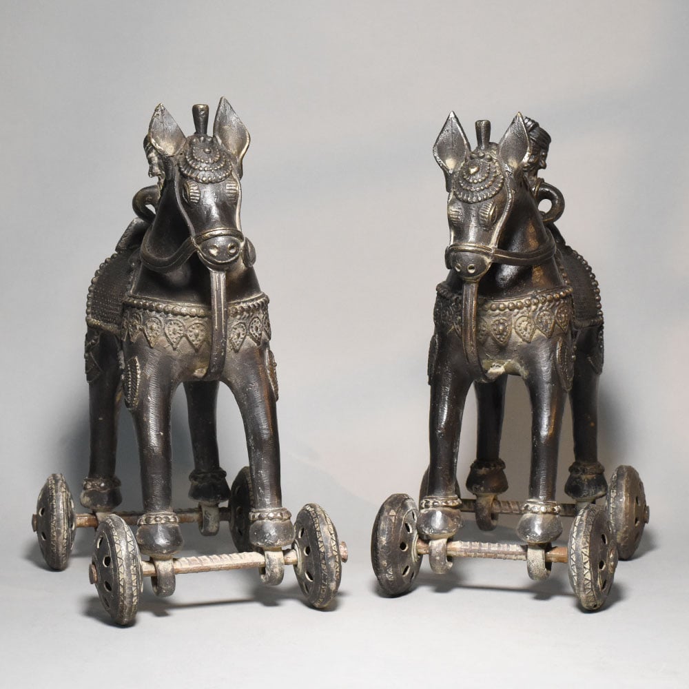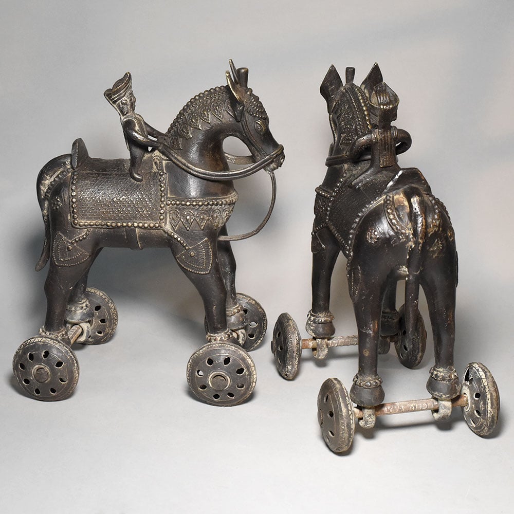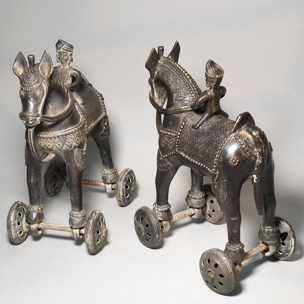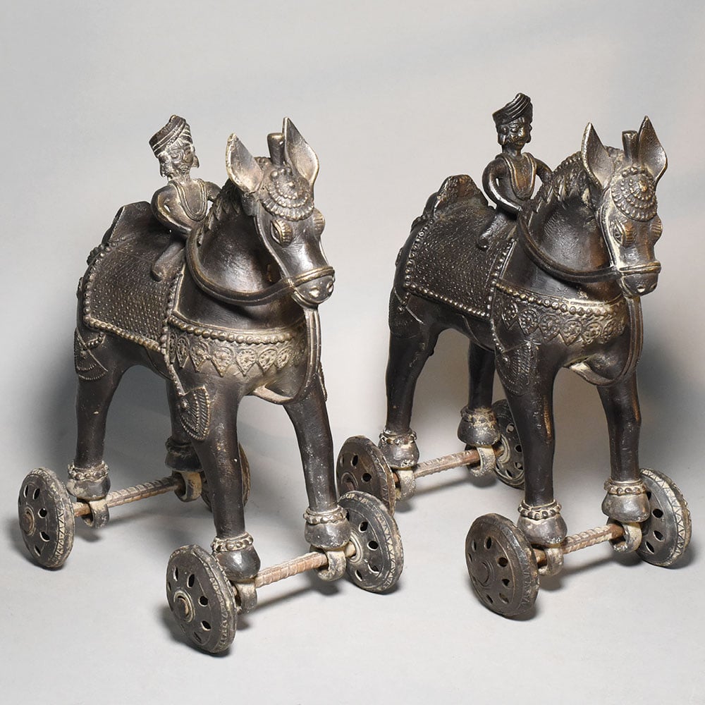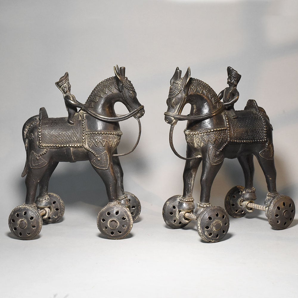 This pair of vintage brass horse rider rolling toy figurines reflects a traditional style of Indian folk metal craft where sculpture and movement come together in a playful mechanical form. Each figurine features a rider seated on a decorated horse, mounted on small rolling wheels that allow the piece to move across a surface. The horses are crafted with stylized proportions and adorned with engraved saddle cloth patterns, ornamental harness detailing, and small decorative motifs across the body. The riders wear traditional headgear and sit upright in a poised posture, suggesting scenes inspired by historical cavalry figures or village storytelling traditions. Mounted beneath the legs of each horse is a simple wheel mechanism made from metal axles and circular patterned wheels. This rolling structure gives the figurines their identity as traditional mechanical toys, once commonly handcrafted by rural artisans for both play and display. The brass surface shows a naturally aged patina with darker tones and subtle highlights that emphasize the sculpted textures and engraved patterns. This aged finish enhances the vintage character of the figures while revealing the hand-worked craftsmanship of the metal. Perfect for collectors of folk art toys, antique dcor enthusiasts, or lovers of traditional Indian metal artifacts, this horse rider pair offers both cultural charm and decorative appeal.