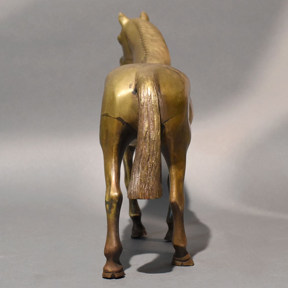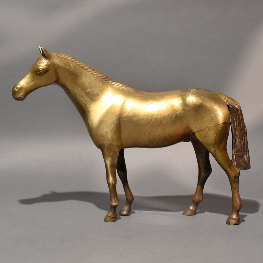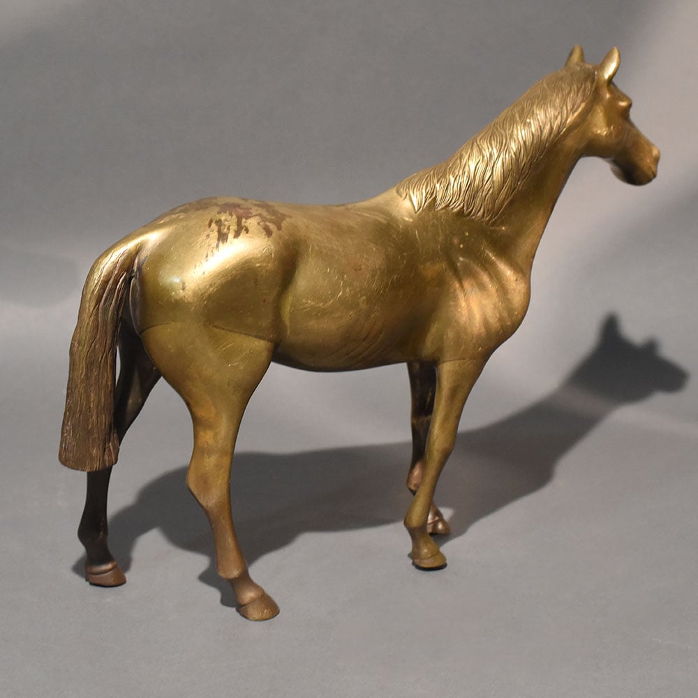 This vintage brass horse sculpture handcrafted in solid metal captures elegance, strength, and graceful movement in a refined decorative form. Designed in a standing posture with a slightly inclined head and defined muscular contours, the figure reflects balance and poised energy. The smooth body lines and minimal detailing give it a clean, timeless aesthetic suitable for both modern and classic interiors. The sculpture features a warm antique brass finish with subtle tonal shading across the legs and tail, enhancing depth and character. The gently carved mane and defined facial features add realism while maintaining a streamlined artistic interpretation. Its elongated proportions and stable stance make it ideal for display on console tables, office desks, bookshelves, or curated collectible arrangements. Horses are traditionally associated with power, freedom, and forward momentum. In decorative symbolism, they often represent success, ambition, and vitality. This handcrafted brass horse figurine can serve as an inspiring accent in workspaces or as a refined statement piece in living areas. Crafted using traditional casting techniques, the solid brass structure ensures durability and long-lasting appeal. Natural variations in finish highlight its artisanal authenticity, making each piece subtly unique.