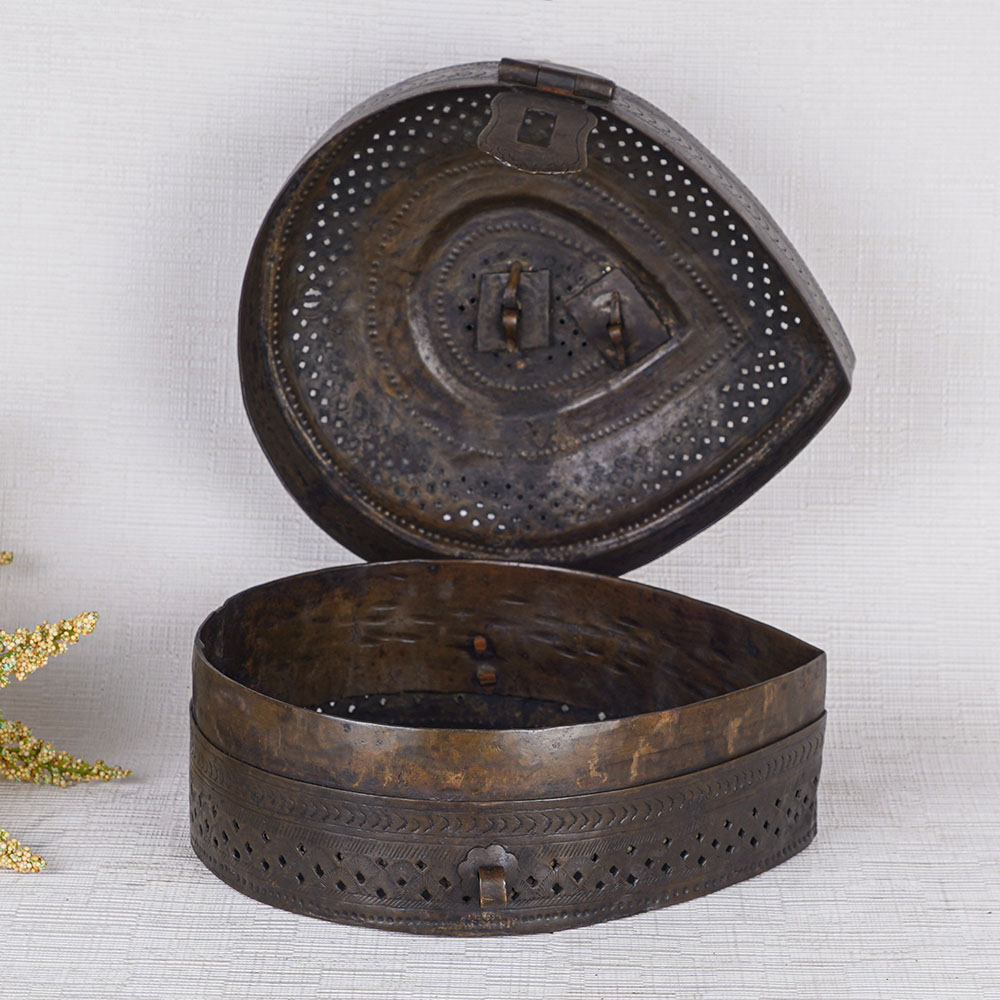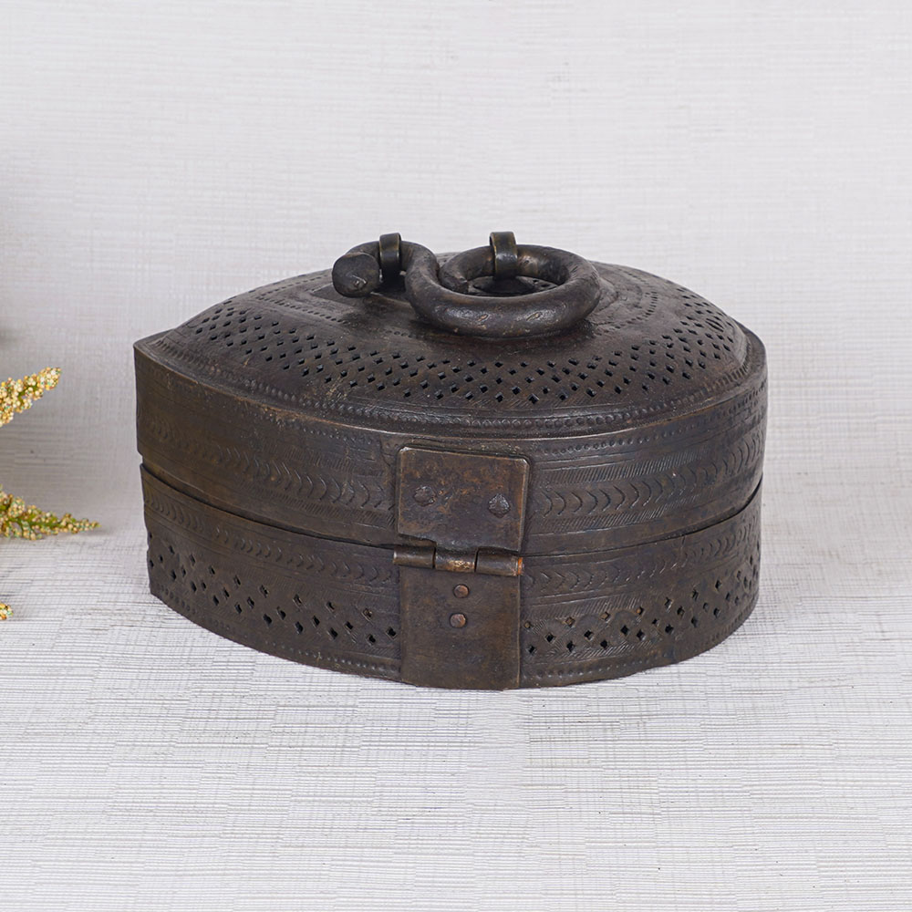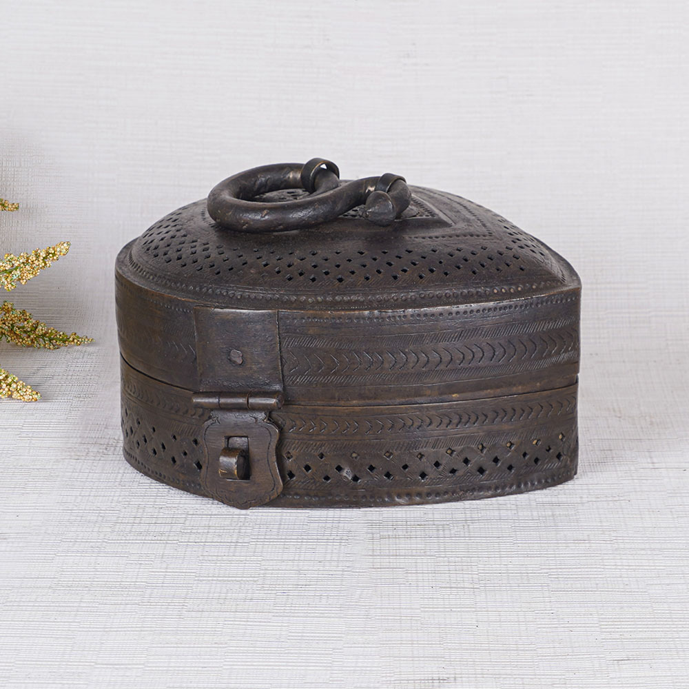 Buy a vintage brass jewelry box online that is made by local Indian artisans with their hands. Crafted with precision and attention to detail, this jewelry box showcases the timeless beauty of high-quality brass with a sleek black finish. Designed for storing precious items and jewelry, this versatile piece now serves as a stunning decorative accent for any home, office, restaurant, or hotel. Its intricate jali engraving adds an elegant touch, while the latch ensures secure storage and the convenient handle allows for easy transport. Ideal for displaying at exhibitions or museums, this jewelry box is a captivating conversation starter. It is also the perfect gift for your loved ones on special or festive occasions, offering them a piece of vintage charm and a place to store their cherished jewelry or precious stones. Embrace the allure of this best jewelry box, a true embodiment of craftsmanship and elegance.