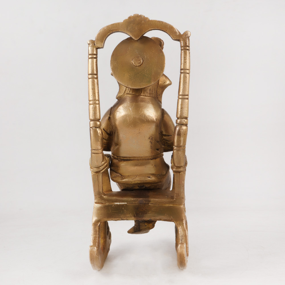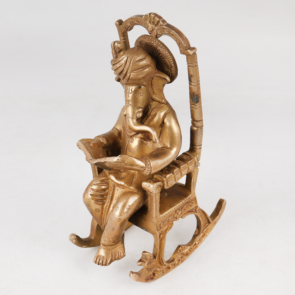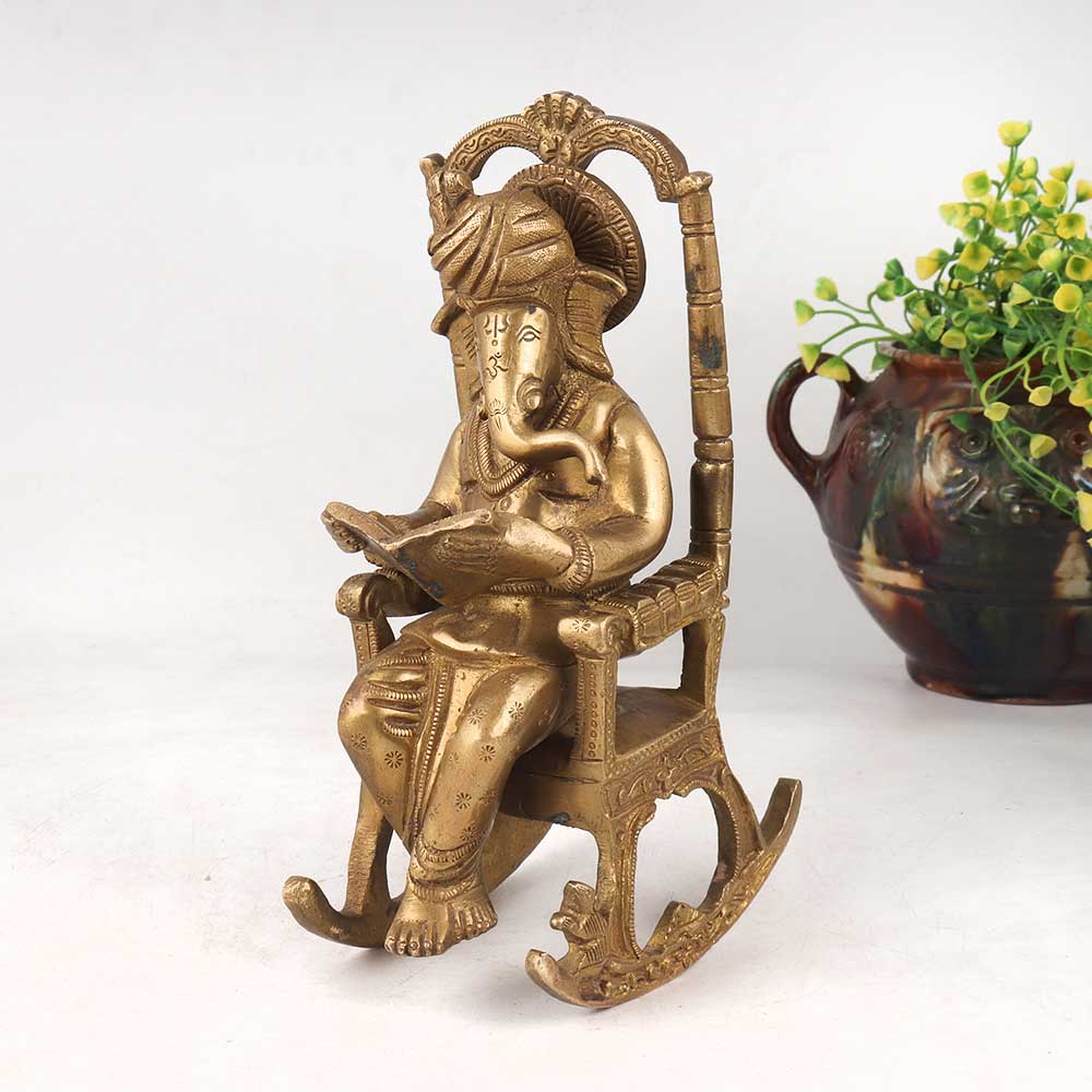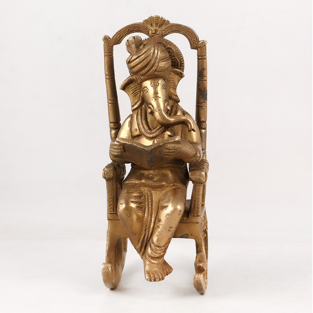 This Brass Lord Ganesha statue sitting on a moveable chair, engrossed in the wisdom of ancient scriptures is an exquisite masterpiece of artistry and devotion adorned in an antique golden finish. Crafted with meticulous care by skilled Indian artisans, this awe-inspiring figurine captures the essence of Lord Ganesha's grace, intelligence, and benevolence. This handcrafted Ganesha statue is a symbol of spirituality and cultural heritage, making it a perfect addition to any home, office, restaurant, hotel, or cafe prayer room for worship, meditation, or as an elegant decoration piece. Its timeless design and remarkable craftsmanship also make it a delightful inclusion in any vintage collection or exhibition. Ideal for gifting, this majestic Lord Ganesha statue can be presented to your loved ones on special or festive occasions, spreading blessings, positivity, and good fortune.