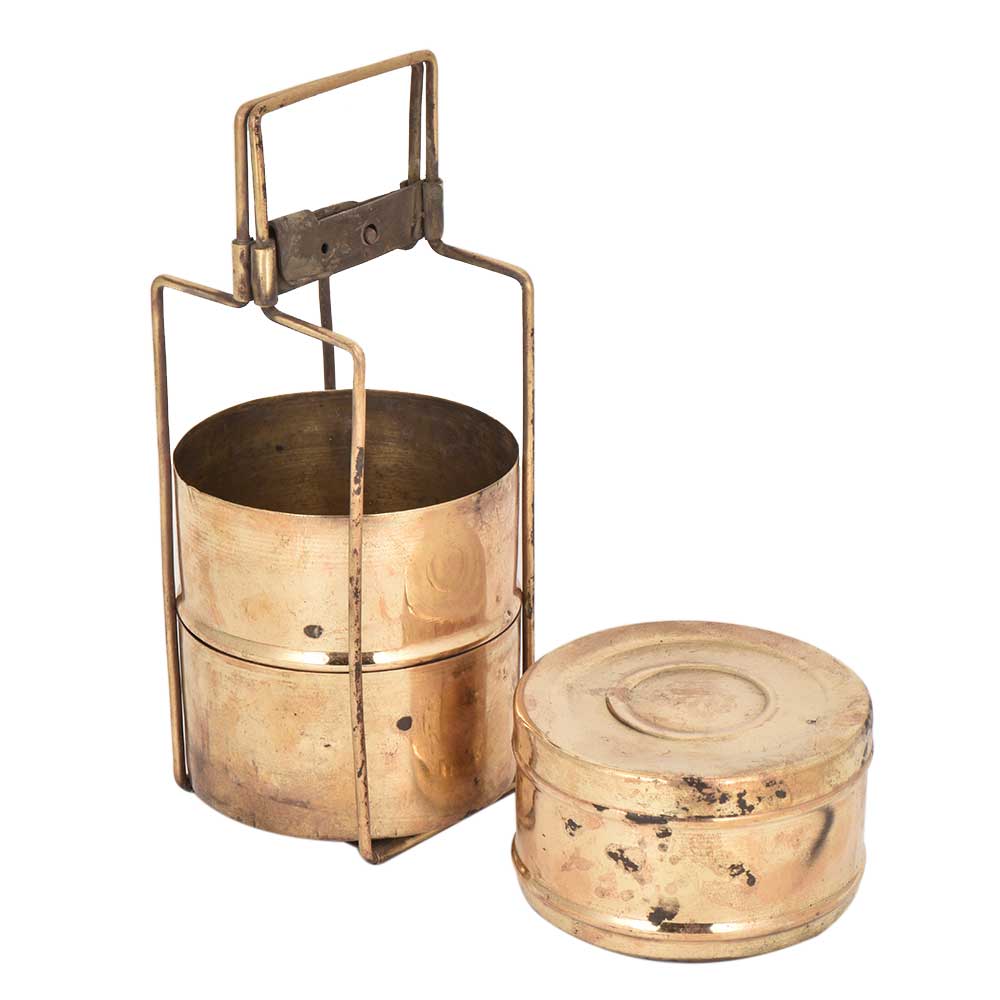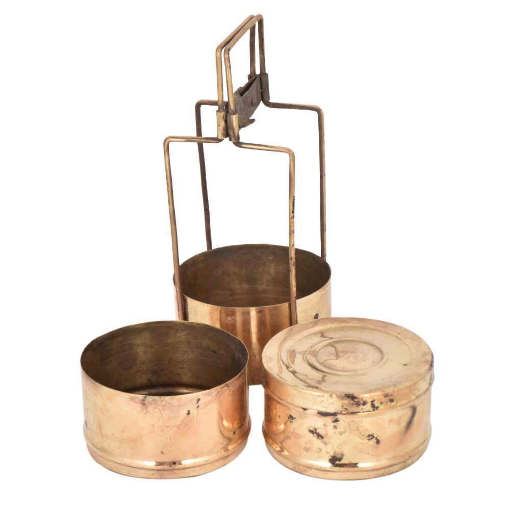 A Brass made vintage lunch box with three separations and a locking handle, with circular lines carved on top of the lid which makes it look premium.
