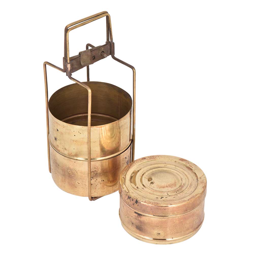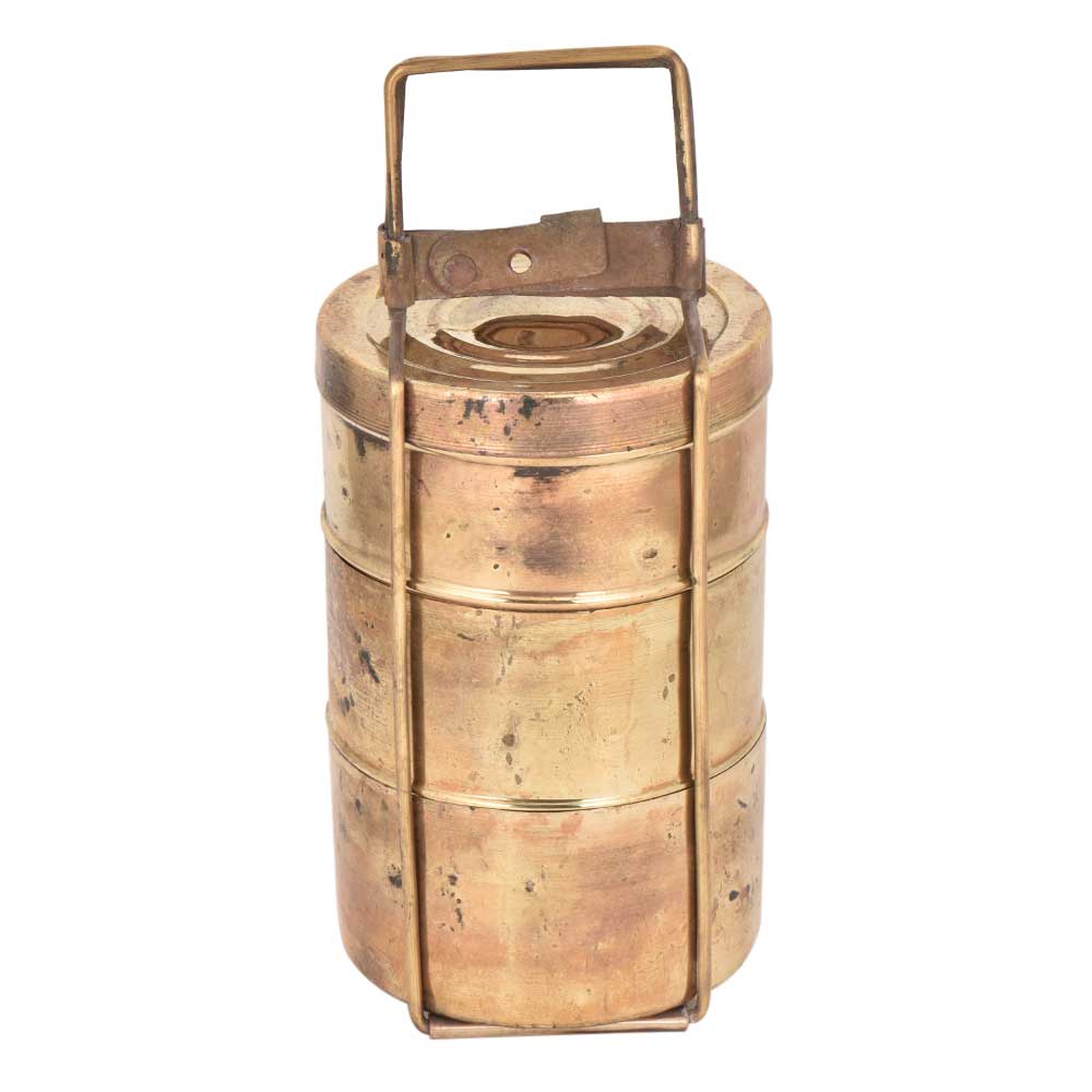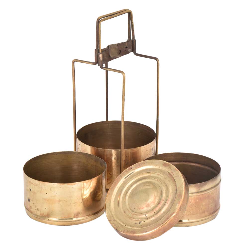 A Brass made vintage lunch box with three separations and a locking handle, with circular lines carved on top of the lid which makes it look premium. It has light reddish finish to it.