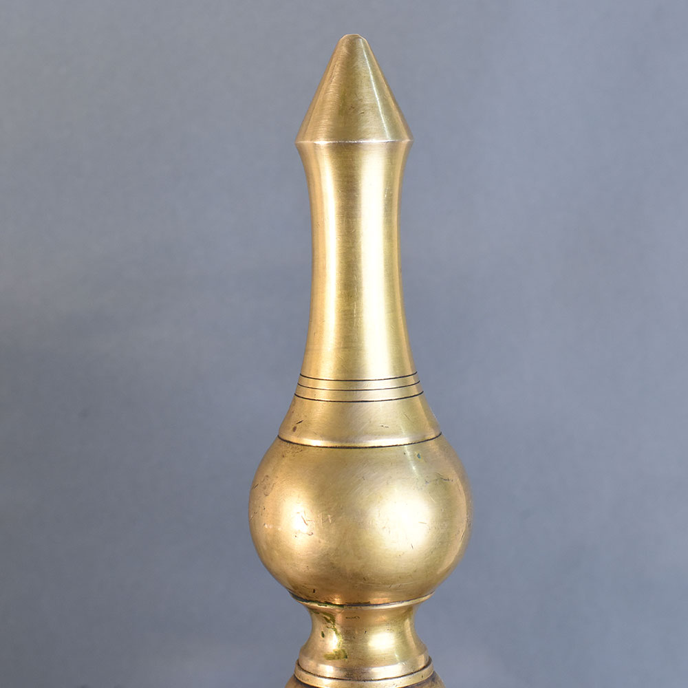 This vintage brass oil lamp pair with Lingam is a stunning representation of South Kerala temple art and devotion. Handcrafted with precision, each lamp features a tall, elegant structure with a central Lingam design at the top, symbolizing divine energy and spiritual power. The broad base provides stability, while the multi-tiered stem enhances its traditional appeal. The shallow oil reservoir is designed for lighting multiple wicks, creating a radiant glow during pooja rituals and festive occasions. Made from solid brass, this pair carries an authentic antique patina, highlighting both durability and cultural richness. These lamps are not only sacred objects for worship but also serve as timeless heritage decor, ideal for temples, pooja rooms, or as auspicious gifts.