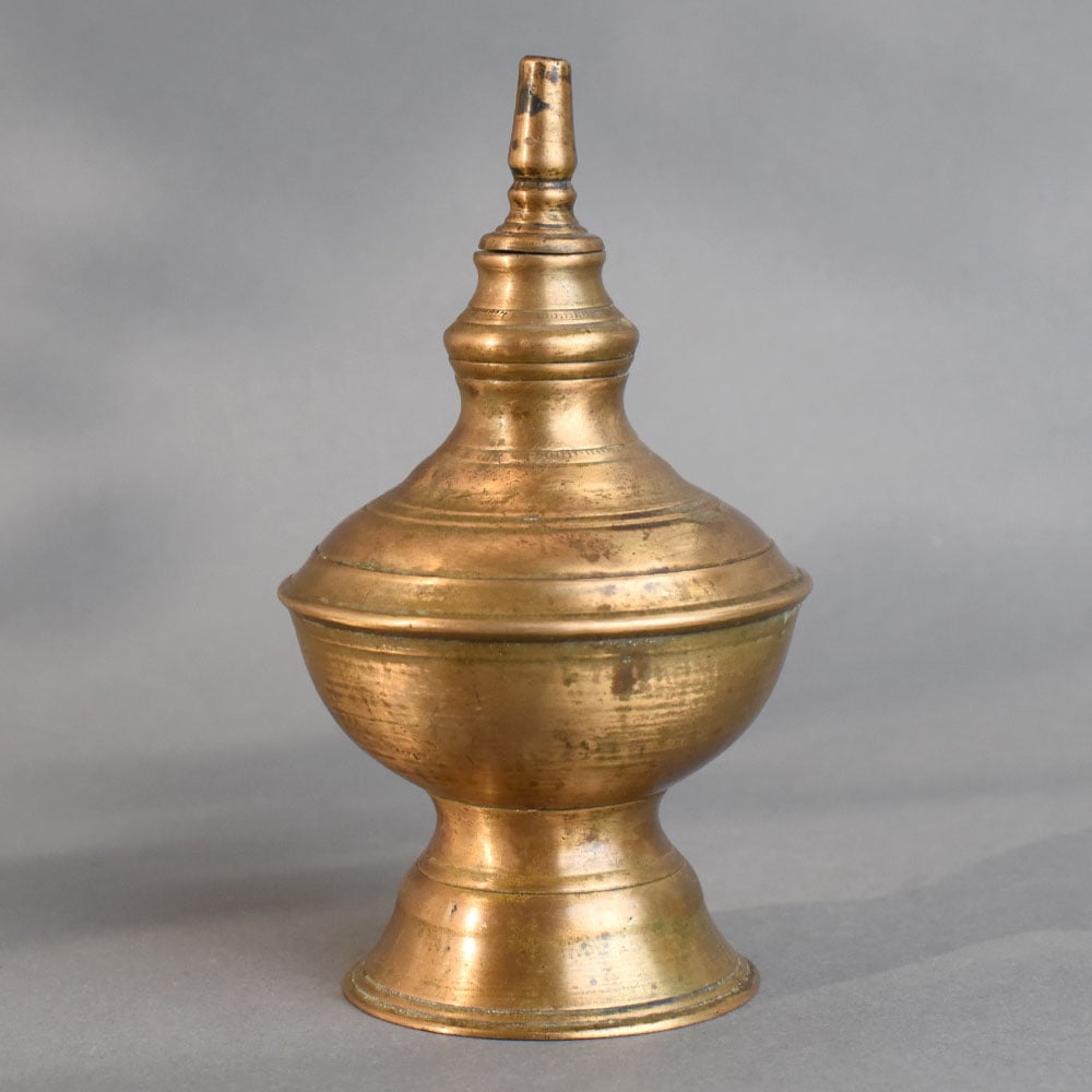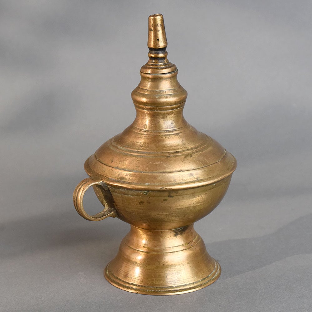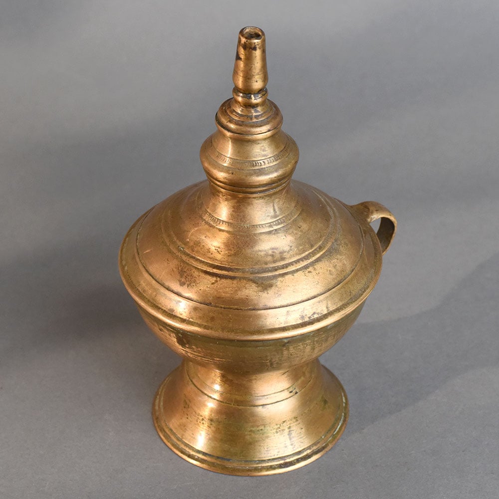 This vintage brass oil lamp with handle from Central India is a fine representation of traditional Indian metalwork and cultural heritage. Handcrafted with a balanced rounded body and a tall spout, it was historically used for storing and pouring oil during pooja rituals and temple ceremonies. The simple yet graceful design is complemented by a sturdy base and a functional side handle for ease of use. Made from durable solid brass, it has developed a rich antique patina over time, adding to its vintage charm. This lamp not only holds ritualistic significance but also makes for a beautiful collectible or decor piece that reflects the artistry of Central India. Perfect for pooja rooms, heritage displays, or as a spiritual gift, it brings a touch of tradition and authenticity to any space.