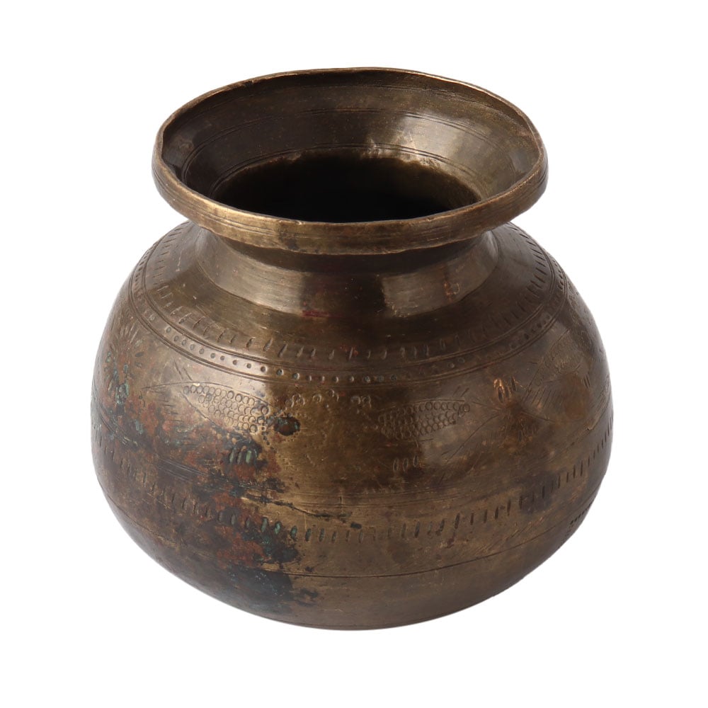The flowers on this vintage decorative brass water pot, or kalash, is exquisitely engraved. This brass water pot has a simple aesthetic, a lovely rustic appeal, and a distinctive form and size. You can use a brass water pot (Lota), which has health benefits, as an everyday utensil or for religious rituals like a pooja ghar.