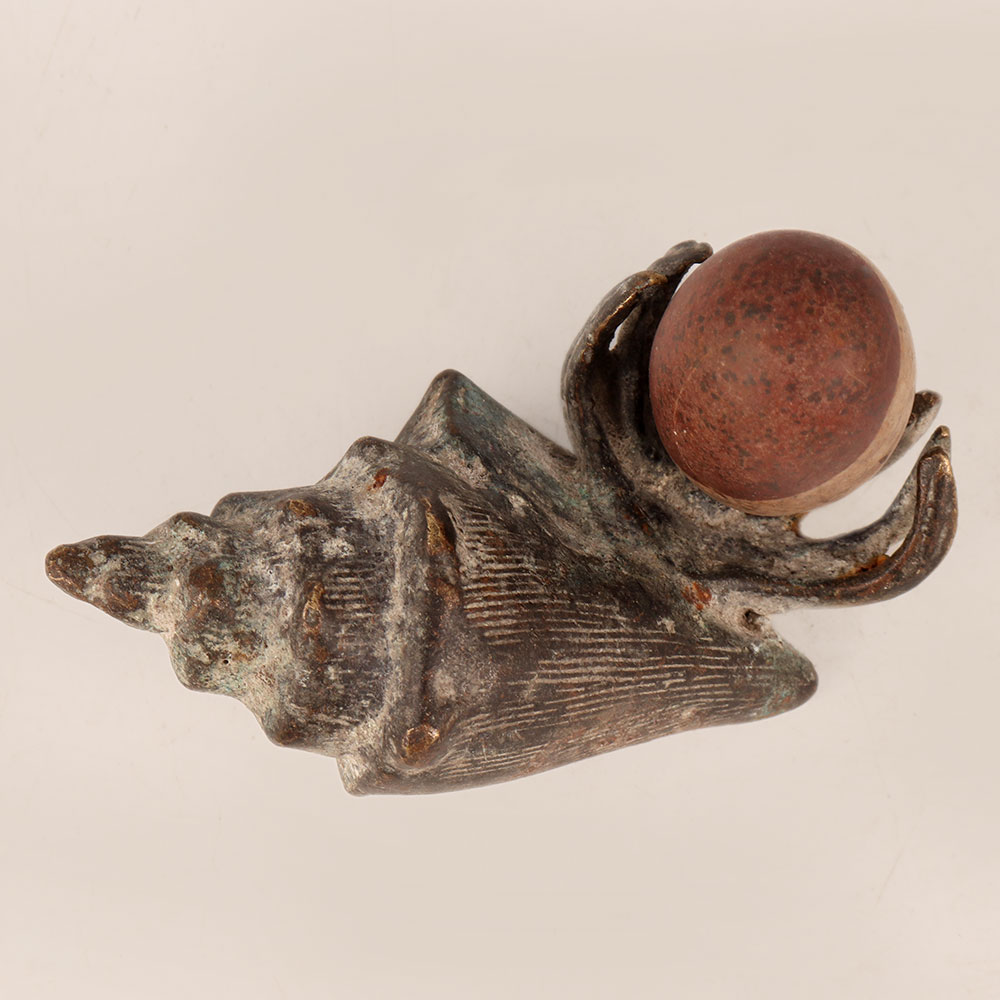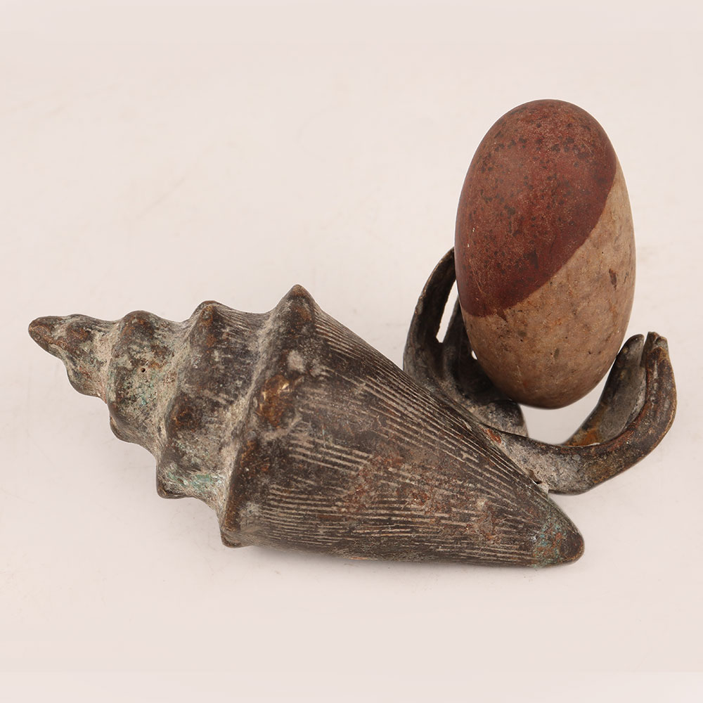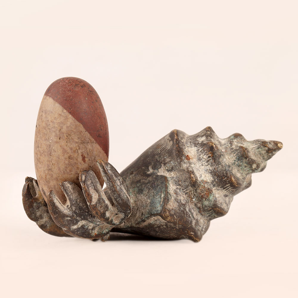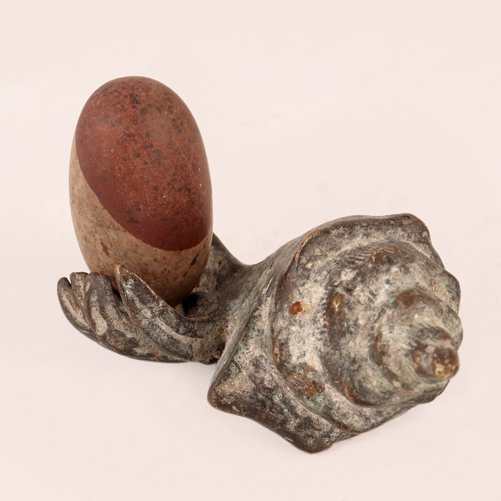 Experience the essence of timeless spirituality with our exquisite Vintage Brass Shell holding Lingam, meticulously handcrafted by talented Indian artisans in the heart of Himalayan Artistry. This masterpiece captures the rich heritage of Indian craftsmanship, featuring a beautifully aged antique finish that lends an air of authenticity and reverence. Crafted with devotion, the Lingam, a revered symbol of divinity and energy, is made from natural stone, each unique in its formation, adding to the charm of this sacred piece. The brass shell cradling the Lingam creates a harmonious blend of materials, further enhancing its aesthetic appeal. This versatile piece finds its place gracefully in various settings – be it your home, office, restaurant, hotel, cafe, or shop's prayer room. Its inherent spiritual aura makes it an ideal focal point for meditation and reflection, while its artistic beauty elevates any space's decor. Collectors of vintage treasures will delight in adding this brass Shell holding Lingam to their assemblage, celebrating both its historical and artistic significance. Additionally, this masterpiece is a thoughtful gift choice, perfect for sharing your affection on special, festive, or auspicious occasions.