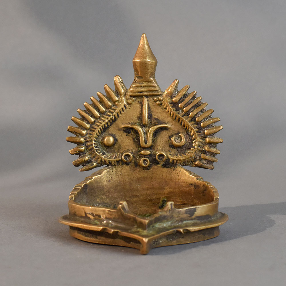 This vintage brass South Indian diya is a stunning example of traditional craftsmanship, designed to bring light, purity, and devotion into your home. Handcrafted from solid brass, it features an ornate sunburst and floral motif on the backplate, symbolizing divine energy and auspiciousness. The diya’s antique finish adds a timeless appeal, making it suitable for pooja rituals, meditation, festivals, or simply as a decorative heritage piece. Its durable brass construction ensures longevity, while the intricate detailing reflects the essence of South Indian temple art. This diya is not only a spiritual accessory but also a collectible piece of art that enhances the charm of your living space. Ideal for gifting during festive occasions, weddings, or housewarmings, it serves as a meaningful reminder of tradition and faith.
